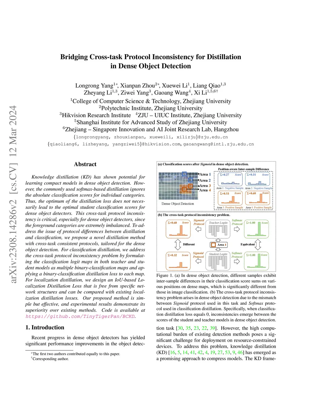 Knowledge distillation (KD) has shown potential for learning compact models in dense object detection. However, the commonly used softmax-based distillation ignores the absolute classification scores for individual categories. Thus, the optimum of the distillation loss does not necessarily lead to the optimal student classification scores for dense object detectors. This cross-task protocol inconsistency is critical, especially for dense object detectors, since the foreground categories are extremely imbalanced. To address the issue of protocol differences between distillation and classification, we propose a novel distillation method with cross-task consistent protocols, tailored for the dense object detection. For classification distillation, we address the cross-task protocol inconsistency problem by formulating the classification logit maps in both teacher and student models as multiple binary-classification maps and applying a binary-classification distillation loss to each map. For localization distillation, we design an IoU-based Localization Distillation Loss that is free from specific network structures and can be compared with existing localization distillation losses. Our proposed method is simple but effective, and experimental results demonstrate its superiority over existing methods. Code is available at https://github.com/TinyTigerPan/BCKD.