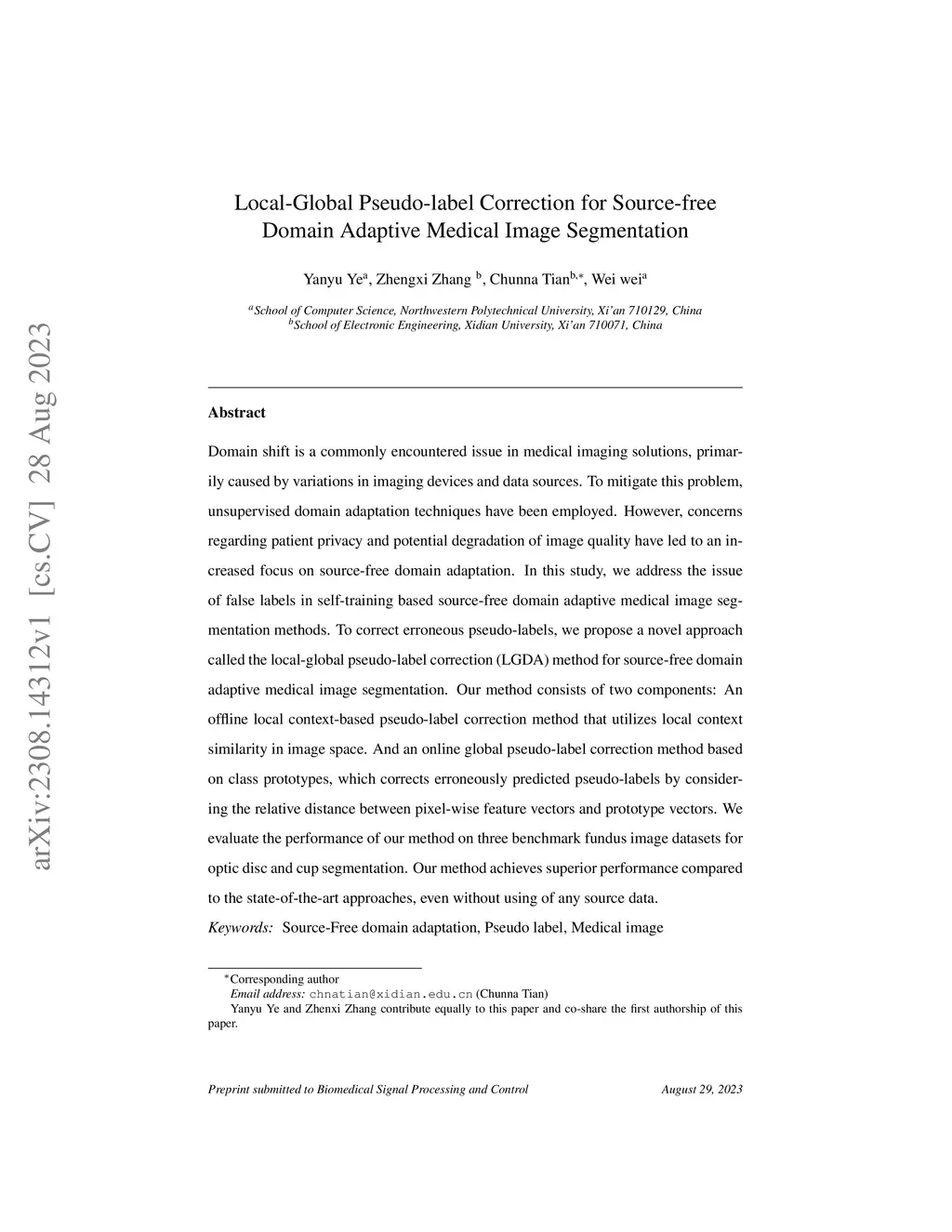 Domain shift is a commonly encountered issue in medical imaging solutions, primarily caused by variations in imaging devices and data sources. To mitigate this problem, unsupervised domain adaptation techniques have been employed. However, concerns regarding patient privacy and potential degradation of image quality have led to an increased focus on source-free domain adaptation. In this study, we address the issue of false labels in self-training based source-free domain adaptive medical image segmentation methods. To correct erroneous pseudo-labels, we propose a novel approach called the local-global pseudo-label correction (LGDA) method for source-free domain adaptive medical image segmentation. Our method consists of two components: An offline local context-based pseudo-label correction method that utilizes local context similarity in image space. And an online global pseudo-label correction method based on class prototypes, which corrects erroneously predicted pseudo-labels by considering the relative distance between pixel-wise feature vectors and prototype vectors. We evaluate the performance of our method on three benchmark fundus image datasets for optic disc and cup segmentation. Our method achieves superior performance compared to the state-of-the-art approaches, even without using of any source data.
