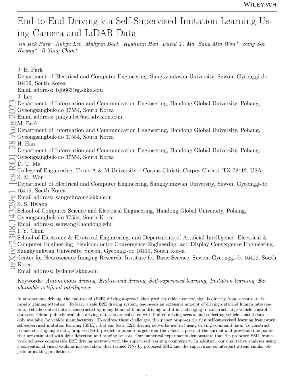 End-to-End Driving via Self-Supervised Imitation Learning Using Camera and LiDAR Data