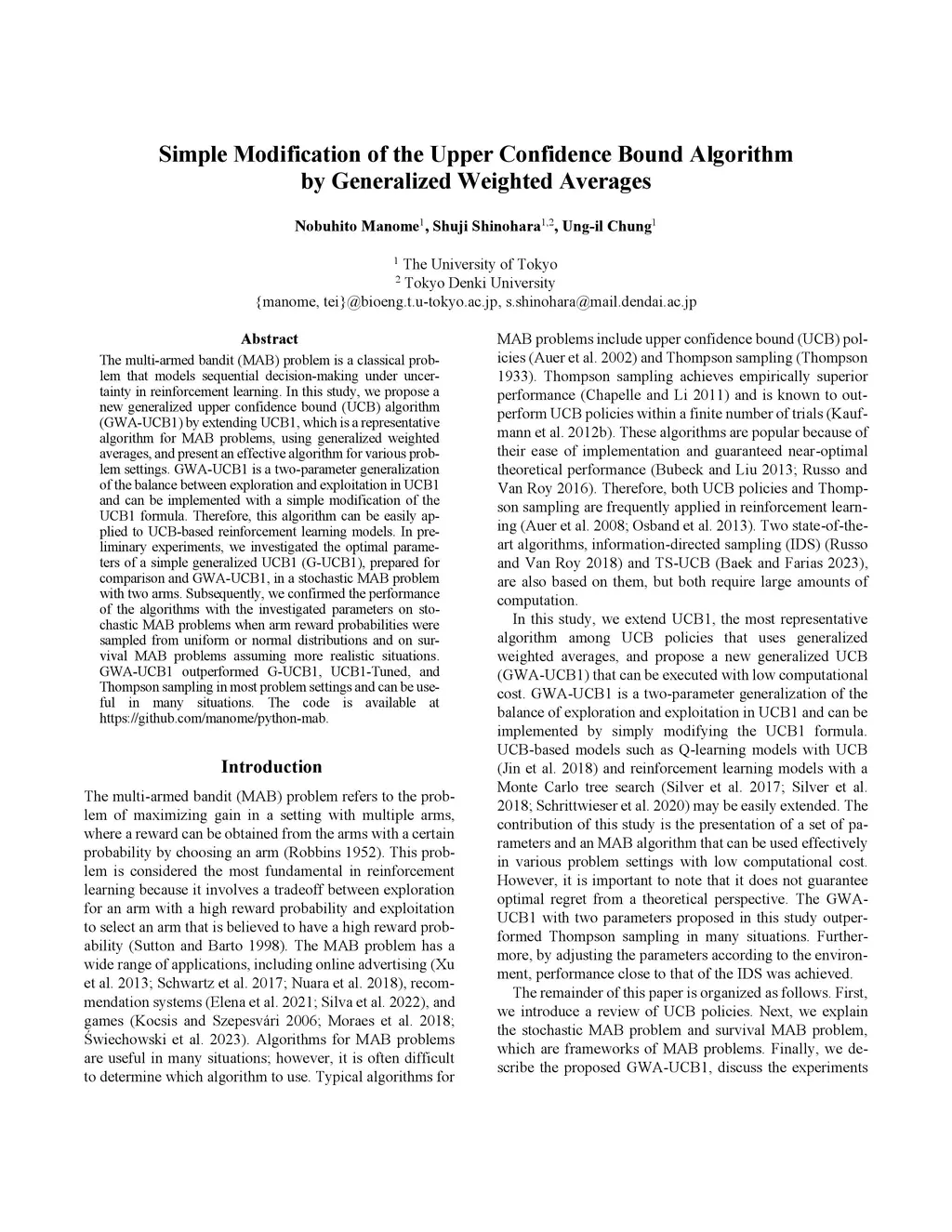 The multi-armed bandit (MAB) problem is a classical problem that models sequential decision-making under uncertainty in reinforcement learning. In this study, we propose a new generalized upper confidence bound (UCB) algorithm (GWA-UCB1) by extending UCB1, which is a representative algorithm for MAB problems, using generalized weighted averages, and present an effective algorithm for various problem settings. GWA-UCB1 is a two-parameter generalization of the balance between exploration and exploitation in UCB1 and can be implemented with a simple modification of the UCB1 formula. Therefore, this algorithm can be easily applied to UCB-based reinforcement learning models. In preliminary experiments, we investigated the optimal parameters of a simple generalized UCB1 (G-UCB1), prepared for comparison and GWA-UCB1, in a stochastic MAB problem with two arms. Subsequently, we confirmed the performance of the algorithms with the investigated parameters on stochastic MAB problems when arm reward probabilities were sampled from uniform or normal distributions and on survival MAB problems assuming more realistic situations. GWA-UCB1 outperformed G-UCB1, UCB1-Tuned, and Thompson sampling in most problem settings and can be useful in many situations. The code is available at https://github.com/manome/python-mab.