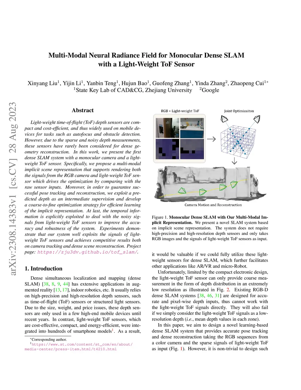 Light-weight time-of-flight (ToF) depth sensors are compact and cost-efficient, and thus widely used on mobile devices for tasks such as autofocus and obstacle detection. However, due to the sparse and noisy depth measurements, these sensors have rarely been considered for dense geometry reconstruction. In this work, we present the first dense SLAM system with a monocular camera and a light-weight ToF sensor. Specifically, we propose a multi-modal implicit scene representation that supports rendering both the signals from the RGB camera and light-weight ToF sensor which drives the optimization by comparing with the raw sensor inputs. Moreover, in order to guarantee successful pose tracking and reconstruction, we exploit a predicted depth as an intermediate supervision and develop a coarse-to-fine optimization strategy for efficient learning of the implicit representation. At last, the temporal information is explicitly exploited to deal with the noisy signals from light-weight ToF sensors to improve the accuracy and robustness of the system. Experiments demonstrate that our system well exploits the signals of light-weight ToF sensors and achieves competitive results both on camera tracking and dense scene reconstruction. Project page: \url{https://zju3dv.github.io/tof_slam/}.