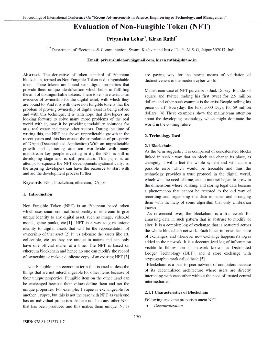 The derivative of token standard of Ethereum blockchain, termed as Non Fungible Token is distinguishable token. These tokens are bound with digital properties that provide them unique identification which helps in fulfilling the aim of distinguishable tokens. These tokens are used as an evidence of ownership for the digital asset, with which they are bound to. And it is with these non fungible tokens that the problem of proving ownership of digital asset is being solved and with this technique, it is with hope that developers are looking forward to solve many more problems of the real world with it, may it be providing tradability solutions for arts, real estate and many other sectors. During the time of writing this, the NFT has shown unpredictable growth in the recent years and this has caused the stimulation of prosperity of DApps(Decentralized Application).With an unpredictable growth and garnering attention worldwide with many mainstream key people investing in it , the NFT is still in developing stage and is still premature. This paper is an attempt to squeeze the NFT developments systematically, so the aspiring developers can have the resource to start with and aid the development process further