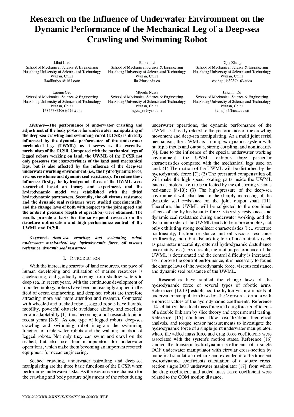 The performance of underwater crawling and adjustment of the body posture for underwater manipulating of the deep-sea crawling and swimming robot (DCSR) is directly influenced by the dynamic performance of the underwater mechanical legs (UWML), as it serves as the executive mechanism of the DCSR. Compared with the mechanical legs of legged robots working on land, the UWML of the DCSR not only possesses the characteristics of the land used mechanical legs, but is also affected by the influence of the deep-sea underwater working environment (i.e., the hydrodynamic force, viscous resistance and dynamic seal resistance). To reduce these influence, firstly, the hydrodynamic force of the UWML were researched based on theory and experiment, and the hydrodynamic model was established with the fitted hydrodynamic parameters. Secondly, the oil viscous resistance and the dynamic seal resistance were studied experimentally, and the change laws of both with respect to the joint speed and the ambient pressure (depth of operation) were obtained. The results provide a basis for the subsequent research on the structure optimization and high performance control of the UWML and DCSR.