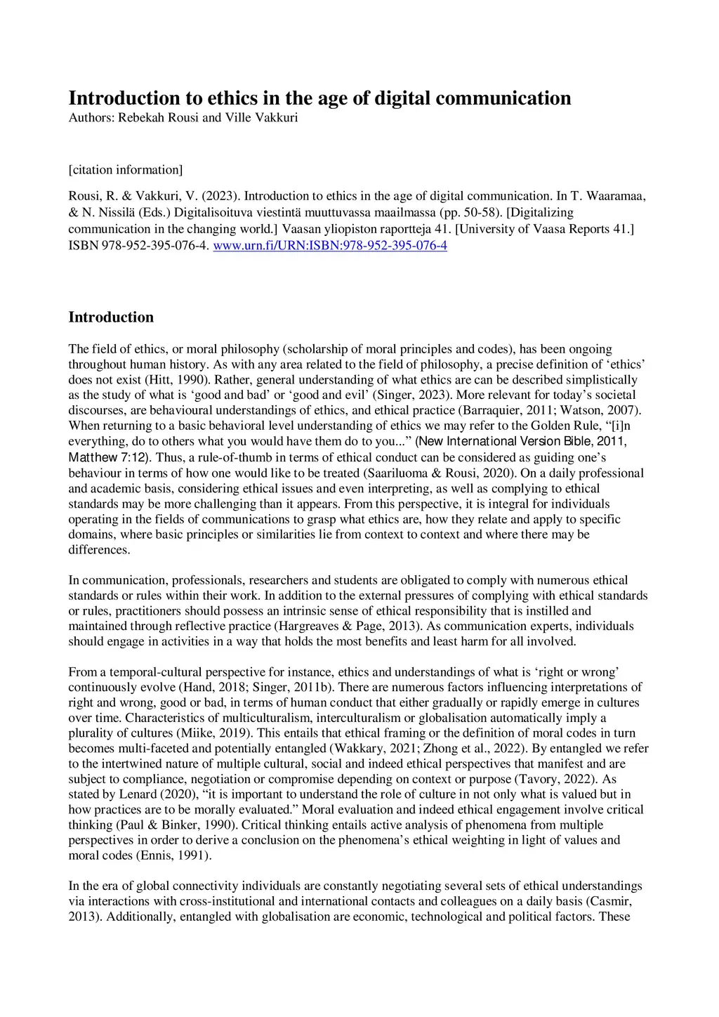 Introduction to ethics in the age of digital communication