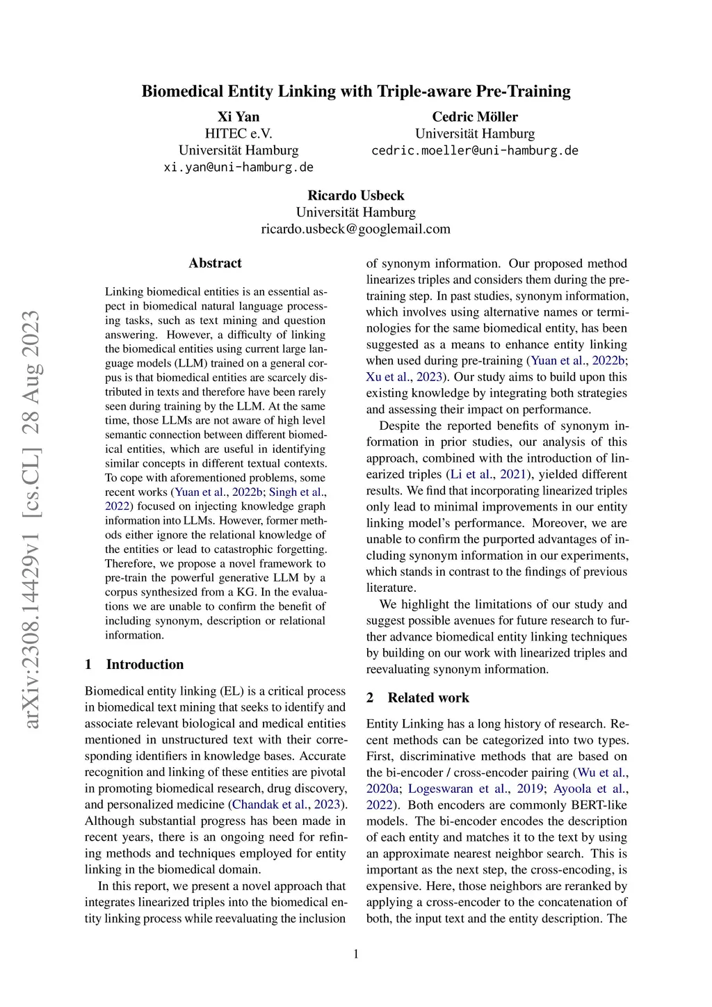 Biomedical Entity Linking with Triple-aware Pre-Training