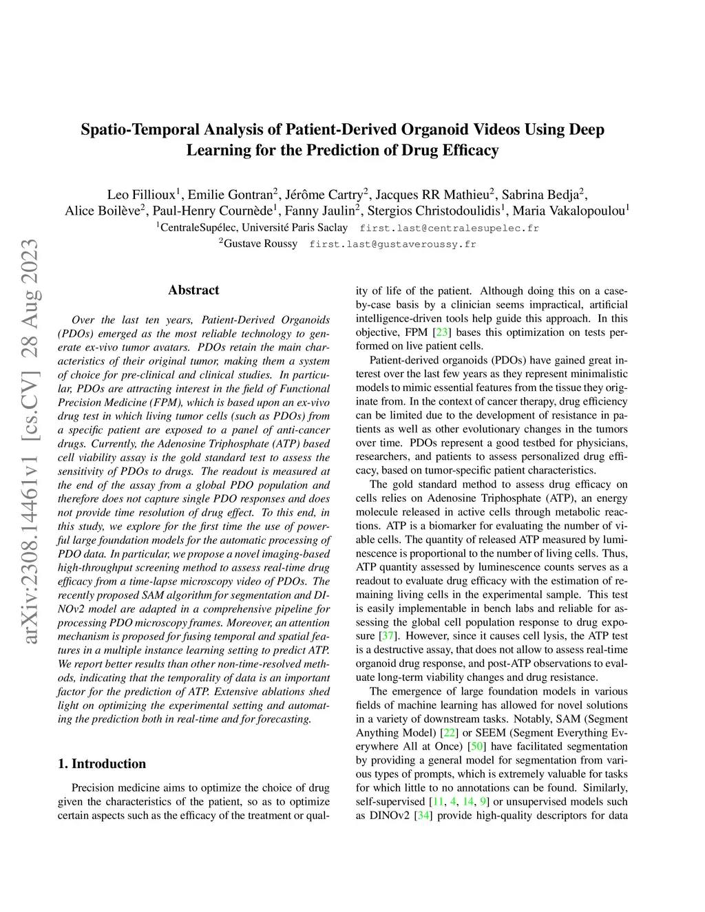 Over the last ten years, Patient-Derived Organoids (PDOs) emerged as the most reliable technology to generate ex-vivo tumor avatars. PDOs retain the main characteristics of their original tumor, making them a system of choice for pre-clinical and clinical studies. In particular, PDOs are attracting interest in the field of Functional Precision Medicine (FPM), which is based upon an ex-vivo drug test in which living tumor cells (such as PDOs) from a specific patient are exposed to a panel of anti-cancer drugs. Currently, the Adenosine Triphosphate (ATP) based cell viability assay is the gold standard test to assess the sensitivity of PDOs to drugs. The readout is measured at the end of the assay from a global PDO population and therefore does not capture single PDO responses and does not provide time resolution of drug effect. To this end, in this study, we explore for the first time the use of powerful large foundation models for the automatic processing of PDO data. In particular, we propose a novel imaging-based high-throughput screening method to assess real-time drug efficacy from a time-lapse microscopy video of PDOs. The recently proposed SAM algorithm for segmentation and DINOv2 model are adapted in a comprehensive pipeline for processing PDO microscopy frames. Moreover, an attention mechanism is proposed for fusing temporal and spatial features in a multiple instance learning setting to predict ATP. We report better results than other non-time-resolved methods, indicating that the temporality of data is an important factor for the prediction of ATP. Extensive ablations shed light on optimizing the experimental setting and automating the prediction both in real-time and for forecasting.