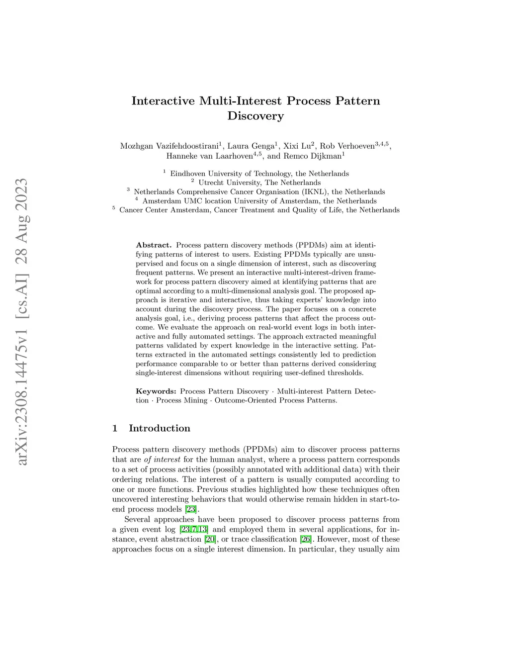 Process pattern discovery methods (PPDMs) aim at identifying patterns of interest to users. Existing PPDMs typically are unsupervised and focus on a single dimension of interest, such as discovering frequent patterns. We present an interactive multi interest driven framework for process pattern discovery aimed at identifying patterns that are optimal according to a multi-dimensional analysis goal. The proposed approach is iterative and interactive, thus taking experts knowledge into account during the discovery process. The paper focuses on a concrete analysis goal, i.e., deriving process patterns that affect the process outcome. We evaluate the approach on real world event logs in both interactive and fully automated settings. The approach extracted meaningful patterns validated by expert knowledge in the interactive setting. Patterns extracted in the automated settings consistently led to prediction performance comparable to or better than patterns derived considering single interest dimensions without requiring user defined thresholds.