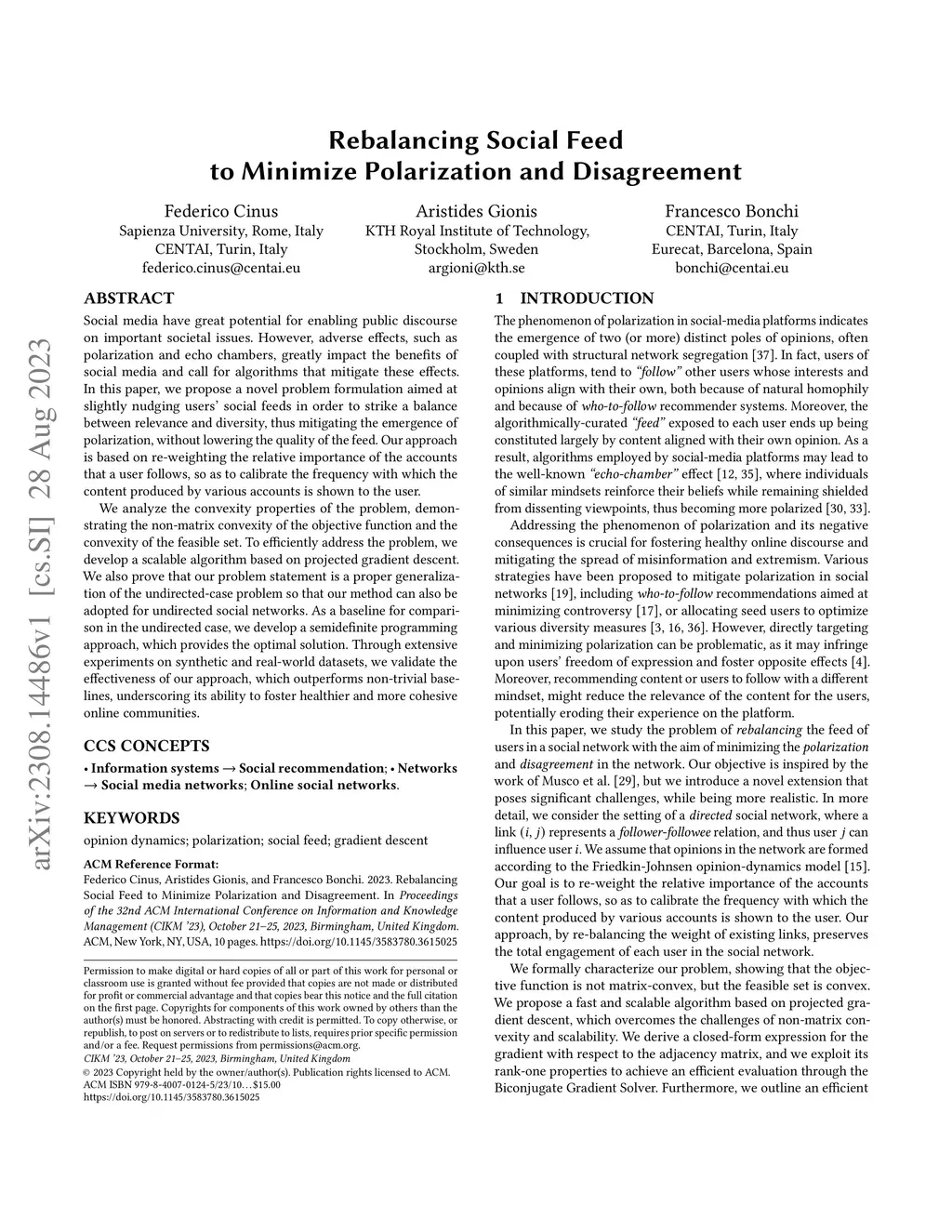 Rebalancing Social Feed to Minimize Polarization and Disagreement