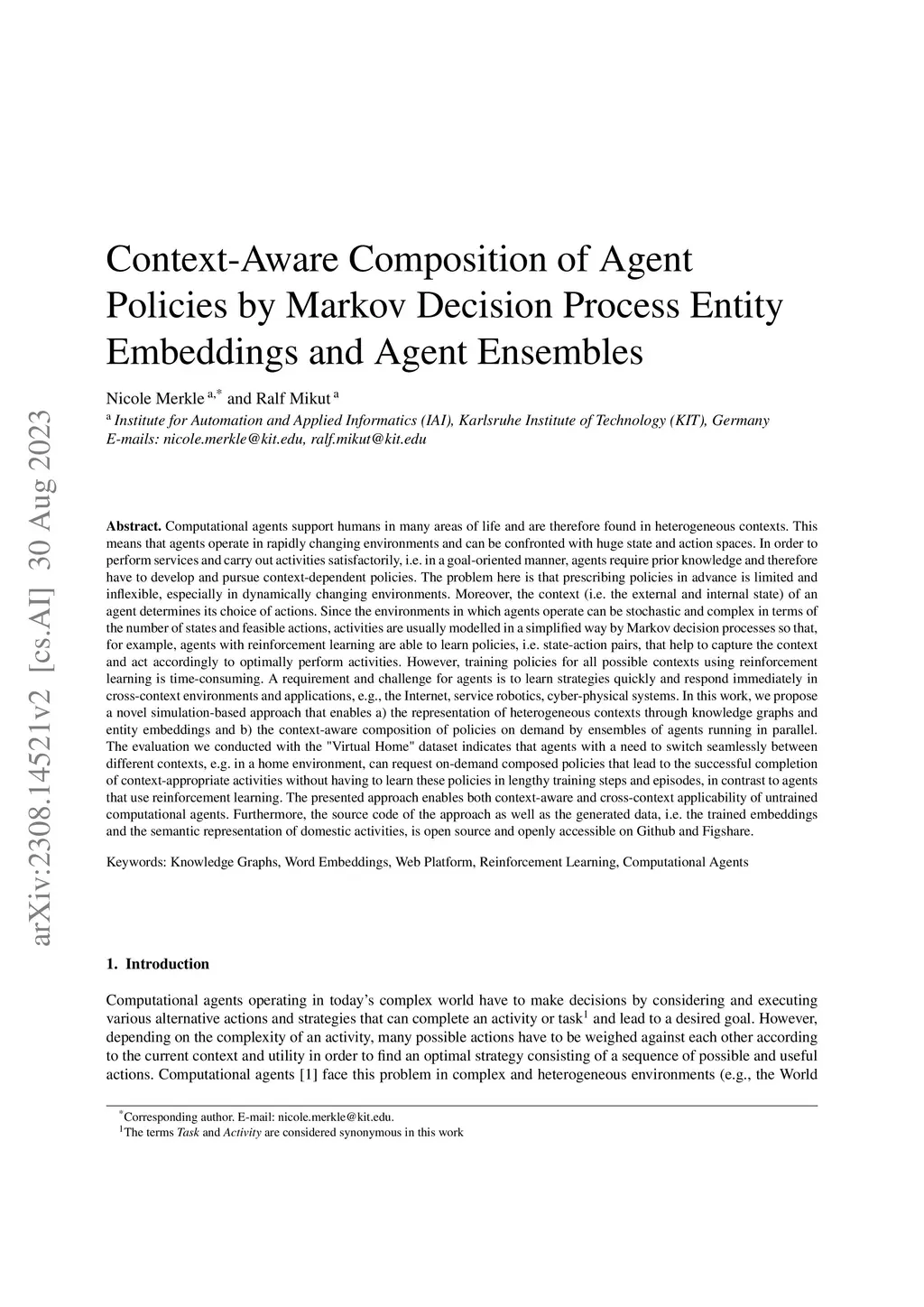 Computational agents support humans in many areas of life and are therefore found in heterogeneous contexts. This means they operate in rapidly changing environments and can be confronted with huge state and action spaces. In order to perform services and carry out activities in a goal-oriented manner, agents require prior knowledge and therefore have to develop and pursue context-dependent policies. However, prescribing policies in advance is limited and inflexible, especially in dynamically changing environments. Moreover, the context of an agent determines its choice of actions. Since the environments can be stochastic and complex in terms of the number of states and feasible actions, activities are usually modelled in a simplified way by Markov decision processes so that, e.g., agents with reinforcement learning are able to learn policies, that help to capture the context and act accordingly to optimally perform activities. However, training policies for all possible contexts using reinforcement learning is time-consuming. A requirement and challenge for agents is to learn strategies quickly and respond immediately in cross-context environments and applications, e.g., the Internet, service robotics, cyber-physical systems. In this work, we propose a novel simulation-based approach that enables a) the representation of heterogeneous contexts through knowledge graphs and entity embeddings and b) the context-aware composition of policies on demand by ensembles of agents running in parallel. The evaluation we conducted with the "Virtual Home" dataset indicates that agents with a need to switch seamlessly between different contexts, can request on-demand composed policies that lead to the successful completion of context-appropriate activities without having to learn these policies in lengthy training steps and episodes, in contrast to agents that use reinforcement learning.