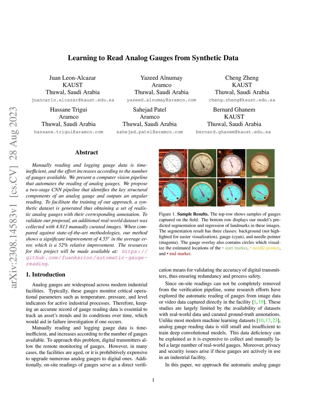 Manually reading and logging gauge data is time inefficient, and the effort increases according to the number of gauges available. We present a computer vision pipeline that automates the reading of analog gauges. We propose a two-stage CNN pipeline that identifies the key structural components of an analog gauge and outputs an angular reading. To facilitate the training of our approach, a synthetic dataset is generated thus obtaining a set of realistic analog gauges with their corresponding annotation. To validate our proposal, an additional real-world dataset was collected with 4.813 manually curated images. When compared against state-of-the-art methodologies, our method shows a significant improvement of 4.55 in the average error, which is a 52% relative improvement. The resources for this project will be made available at: https://github.com/fuankarion/automatic-gauge-reading.