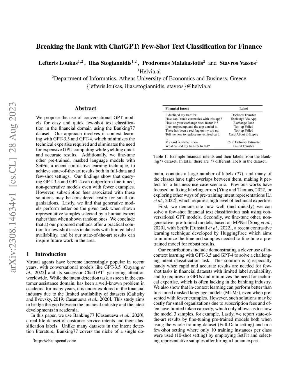 We propose the use of conversational GPT models for easy and quick few-shot text classification in the financial domain using the Banking77 dataset. Our approach involves in-context learning with GPT-3.5 and GPT-4, which minimizes the technical expertise required and eliminates the need for expensive GPU computing while yielding quick and accurate results. Additionally, we fine-tune other pre-trained, masked language models with SetFit, a recent contrastive learning technique, to achieve state-of-the-art results both in full-data and few-shot settings. Our findings show that querying GPT-3.5 and GPT-4 can outperform fine-tuned, non-generative models even with fewer examples. However, subscription fees associated with these solutions may be considered costly for small organizations. Lastly, we find that generative models perform better on the given task when shown representative samples selected by a human expert rather than when shown random ones. We conclude that a) our proposed methods offer a practical solution for few-shot tasks in datasets with limited label availability, and b) our state-of-the-art results can inspire future work in the area.
