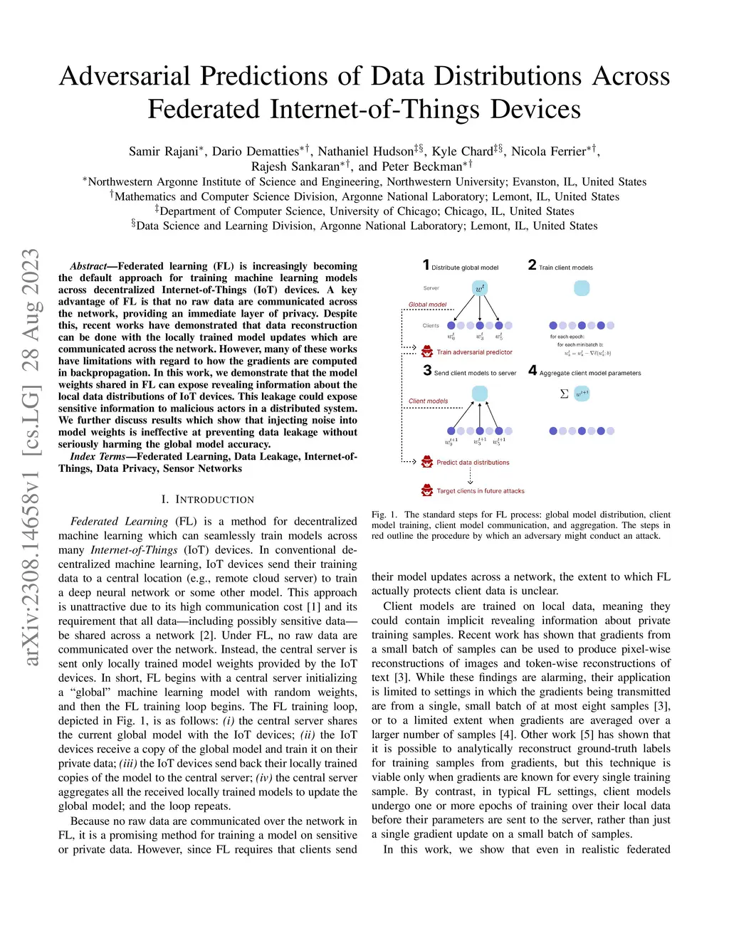 Federated learning (FL) is increasingly becoming the default approach for training machine learning models across decentralized Internet-of-Things (IoT) devices. A key advantage of FL is that no raw data are communicated across the network, providing an immediate layer of privacy. Despite this, recent works have demonstrated that data reconstruction can be done with the locally trained model updates which are communicated across the network. However, many of these works have limitations with regard to how the gradients are computed in backpropagation. In this work, we demonstrate that the model weights shared in FL can expose revealing information about the local data distributions of IoT devices. This leakage could expose sensitive information to malicious actors in a distributed system. We further discuss results which show that injecting noise into model weights is ineffective at preventing data leakage without seriously harming the global model accuracy.