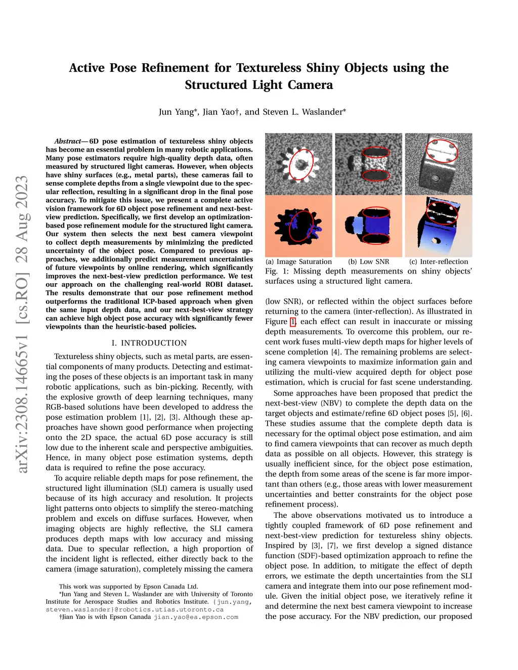 6D pose estimation of textureless shiny objects has become an essential problem in many robotic applications. Many pose estimators require high-quality depth data, often measured by structured light cameras. However, when objects have shiny surfaces (e.g., metal parts), these cameras fail to sense complete depths from a single viewpoint due to the specular reflection, resulting in a significant drop in the final pose accuracy. To mitigate this issue, we present a complete active vision framework for 6D object pose refinement and next-best-view prediction. Specifically, we first develop an optimization-based pose refinement module for the structured light camera. Our system then selects the next best camera viewpoint to collect depth measurements by minimizing the predicted uncertainty of the object pose. Compared to previous approaches, we additionally predict measurement uncertainties of future viewpoints by online rendering, which significantly improves the next-best-view prediction performance. We test our approach on the challenging real-world ROBI dataset. The results demonstrate that our pose refinement method outperforms the traditional ICP-based approach when given the same input depth data, and our next-best-view strategy can achieve high object pose accuracy with significantly fewer viewpoints than the heuristic-based policies.