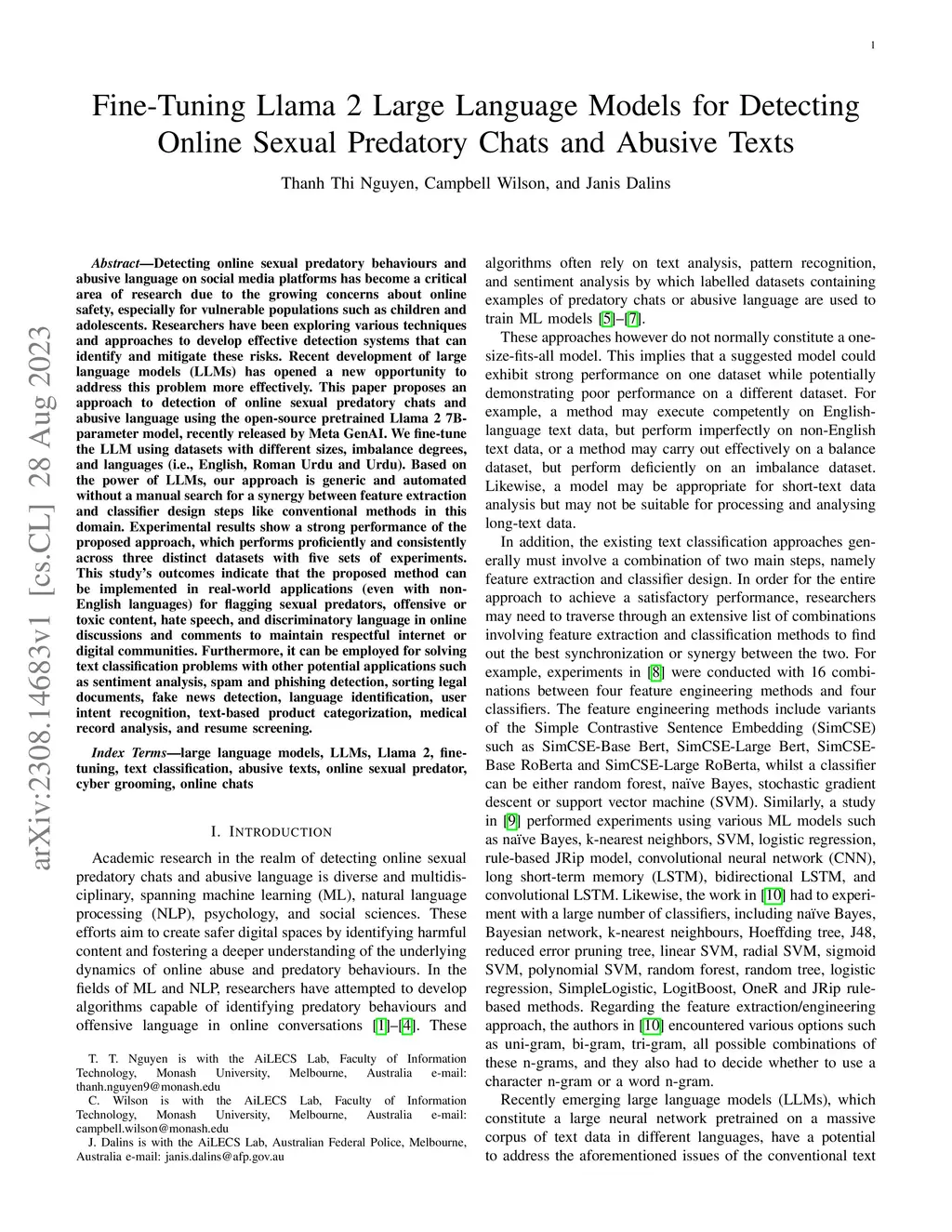 Detecting online sexual predatory behaviours and abusive language on social media platforms has become a critical area of research due to the growing concerns about online safety, especially for vulnerable populations such as children and adolescents. Researchers have been exploring various techniques and approaches to develop effective detection systems that can identify and mitigate these risks. Recent development of large language models (LLMs) has opened a new opportunity to address this problem more effectively. This paper proposes an approach to detection of online sexual predatory chats and abusive language using the open-source pretrained Llama 2 7B-parameter model, recently released by Meta GenAI. We fine-tune the LLM using datasets with different sizes, imbalance degrees, and languages (i.e., English, Roman Urdu and Urdu). Based on the power of LLMs, our approach is generic and automated without a manual search for a synergy between feature extraction and classifier design steps like conventional methods in this domain. Experimental results show a strong performance of the proposed approach, which performs proficiently and consistently across three distinct datasets with five sets of experiments. This study's outcomes indicate that the proposed method can be implemented in real-world applications (even with non-English languages) for flagging sexual predators, offensive or toxic content, hate speech, and discriminatory language in online discussions and comments to maintain respectful internet or digital communities. Furthermore, it can be employed for solving text classification problems with other potential applications such as sentiment analysis, spam and phishing detection, sorting legal documents, fake news detection, language identification, user intent recognition, text-based product categorization, medical record analysis, and resume screening.