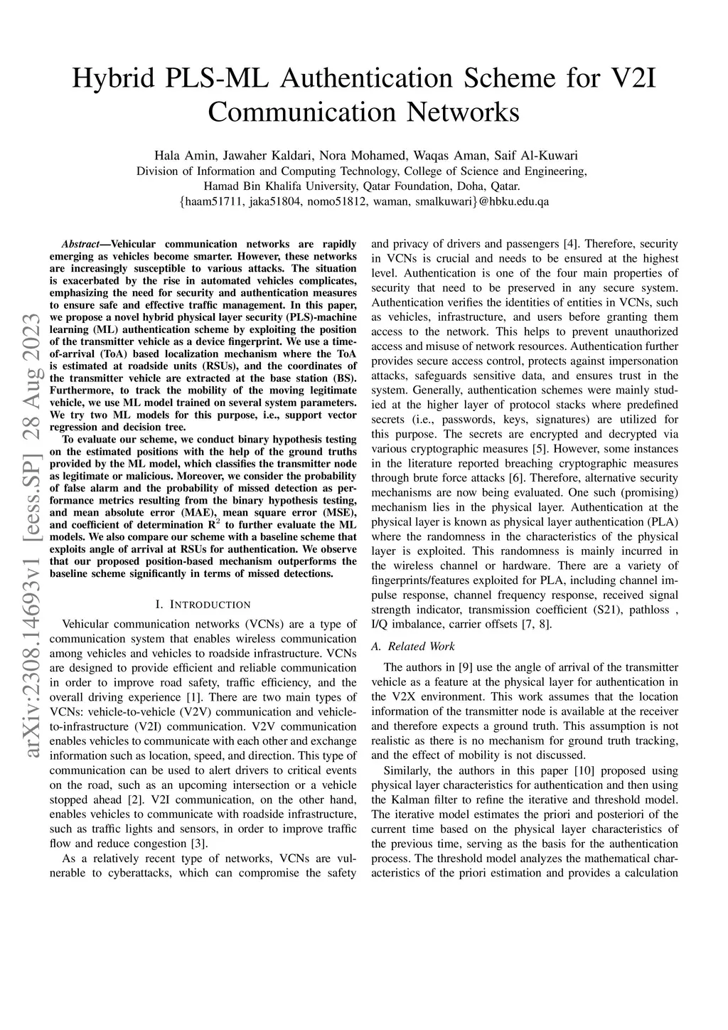 Hybrid PLS-ML Authentication Scheme for V2I Communication Networks