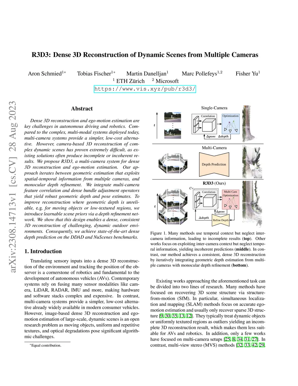 Dense 3D reconstruction and ego-motion estimation are key challenges in autonomous driving and robotics. Compared to the complex, multi-modal systems deployed today, multi-camera systems provide a simpler, low-cost alternative. However, camera-based 3D reconstruction of complex dynamic scenes has proven extremely difficult, as existing solutions often produce incomplete or incoherent results. We propose R3D3, a multi-camera system for dense 3D reconstruction and ego-motion estimation. Our approach iterates between geometric estimation that exploits spatial-temporal information from multiple cameras, and monocular depth refinement. We integrate multi-camera feature correlation and dense bundle adjustment operators that yield robust geometric depth and pose estimates. To improve reconstruction where geometric depth is unreliable, e.g. for moving objects or low-textured regions, we introduce learnable scene priors via a depth refinement network. We show that this design enables a dense, consistent 3D reconstruction of challenging, dynamic outdoor environments. Consequently, we achieve state-of-the-art dense depth prediction on the DDAD and NuScenes benchmarks.