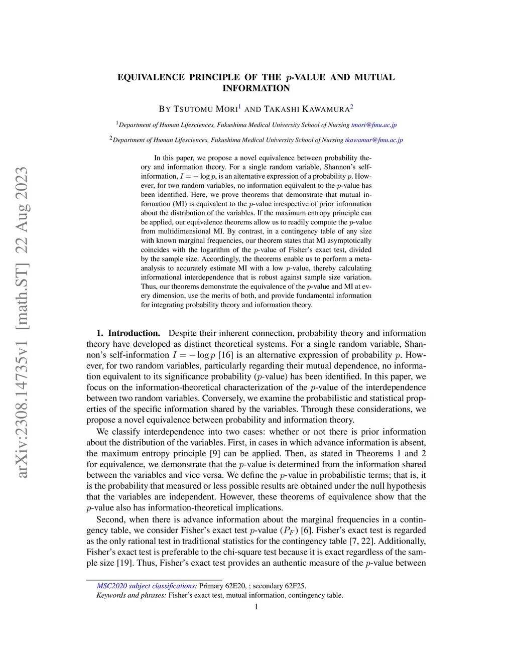 In this paper, we propose a novel equivalence between probability theory and information theory. For a single random variable, Shannon's self-information, , is an alternative expression of a probability . However, for two random variables, no information equivalent to the -value has been identified. Here, we prove theorems that demonstrate that mutual information (MI) is equivalent to the -value irrespective of prior information about the distribution of the variables. If the maximum entropy principle can be applied, our equivalence theorems allow us to readily compute the -value from multidimensional MI. By contrast, in a contingency table of any size with known marginal frequencies, our theorem states that MI asymptotically coincides with the logarithm of the -value of Fisher's exact test, divided by the sample size. Accordingly, the theorems enable us to perform a meta-analysis to accurately estimate MI with a low -value, thereby calculating informational interdependence that is robust against sample size variation. Thus, our theorems demonstrate the equivalence of the -value and MI at every dimension, use the merits of both, and provide fundamental information for integrating probability theory and information theory.