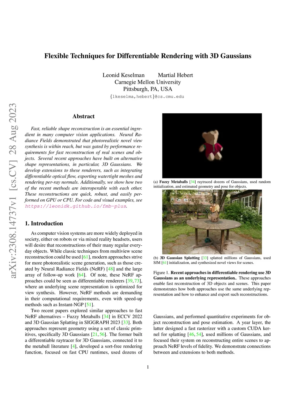 Fast, reliable shape reconstruction is an essential ingredient in many computer vision applications. Neural Radiance Fields demonstrated that photorealistic novel view synthesis is within reach, but was gated by performance requirements for fast reconstruction of real scenes and objects. Several recent approaches have built on alternative shape representations, in particular, 3D Gaussians. We develop extensions to these renderers, such as integrating differentiable optical flow, exporting watertight meshes and rendering per-ray normals. Additionally, we show how two of the recent methods are interoperable with each other. These reconstructions are quick, robust, and easily performed on GPU or CPU. For code and visual examples, see https://leonidk.github.io/fmb-plus