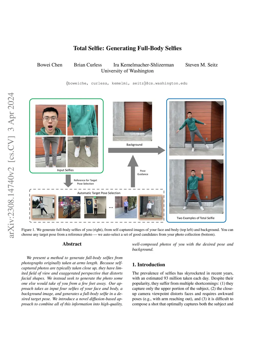 We present a method to generate full-body selfies from photographs originally taken at arms length. Because self-captured photos are typically taken close up, they have limited field of view and exaggerated perspective that distorts facial shapes. We instead seek to generate the photo some one else would take of you from a few feet away. Our approach takes as input four selfies of your face and body, a background image, and generates a full-body selfie in a desired target pose. We introduce a novel diffusion-based approach to combine all of this information into high-quality, well-composed photos of you with the desired pose and background.