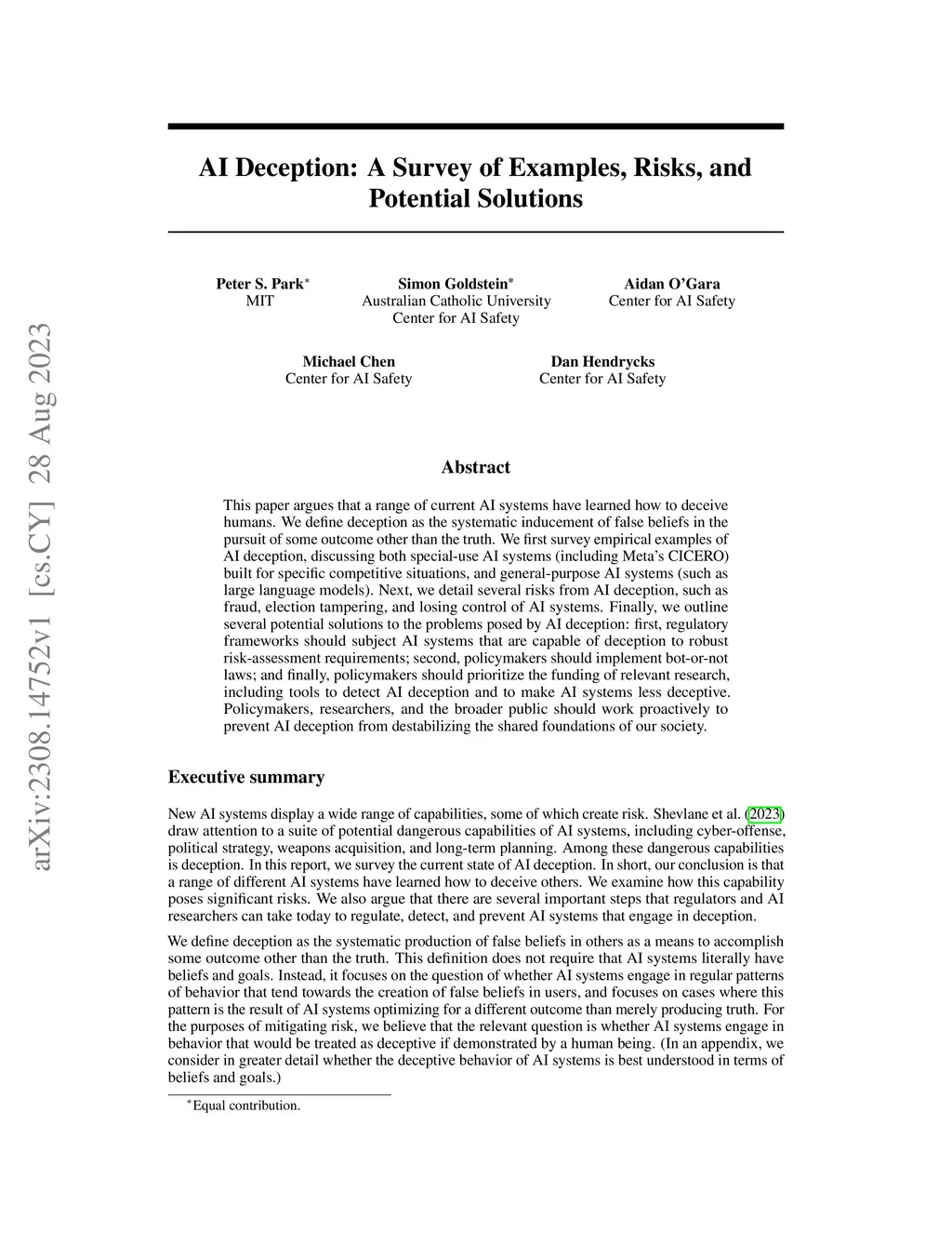 This paper argues that a range of current AI systems have learned how to deceive humans. We define deception as the systematic inducement of false beliefs in the pursuit of some outcome other than the truth. We first survey empirical examples of AI deception, discussing both special-use AI systems (including Meta's CICERO) built for specific competitive situations, and general-purpose AI systems (such as large language models). Next, we detail several risks from AI deception, such as fraud, election tampering, and losing control of AI systems. Finally, we outline several potential solutions to the problems posed by AI deception: first, regulatory frameworks should subject AI systems that are capable of deception to robust risk-assessment requirements; second, policymakers should implement bot-or-not laws; and finally, policymakers should prioritize the funding of relevant research, including tools to detect AI deception and to make AI systems less deceptive. Policymakers, researchers, and the broader public should work proactively to prevent AI deception from destabilizing the shared foundations of our society.