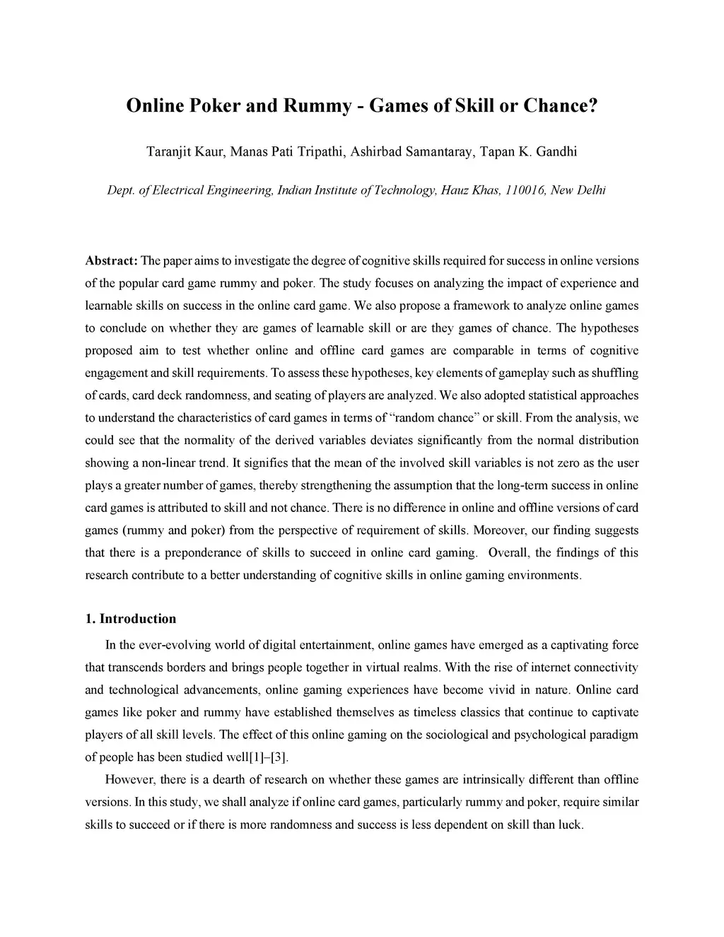 The paper aims to investigate the degree of cognitive skills required for success in online versions of the popular card game rummy and poker. The study focuses on analyzing the impact of experience and learnable skills on success in the online card game. We also propose a framework to analyze online games to conclude on whether they are games of learnable skill or are they games of chance. The hypotheses proposed aim to test whether online and offline card games are comparable in terms of cognitive engagement and skill requirements. To assess these hypotheses, key elements of gameplay such as shuffling of cards, card deck randomness, and seating of players are analyzed. We also adopted statistical approaches to understand the characteristics of card games in terms of random chance or skill. From the analysis, we could see that the normality of the derived variables deviates significantly from the normal distribution showing a non-linear trend. It signifies that the mean of the involved skill variables is not zero as the user plays a greater number of games, thereby strengthening the assumption that the long-term success in online card games is attributed to skill and not chance. There is no difference in online and offline versions of card games (rummy and poker) from the perspective of requirement of skills. Moreover, our finding suggests that there is a preponderance of skills to succeed in online card gaming. Overall, the findings of this research contribute to a better understanding of cognitive skills in online gaming environments.