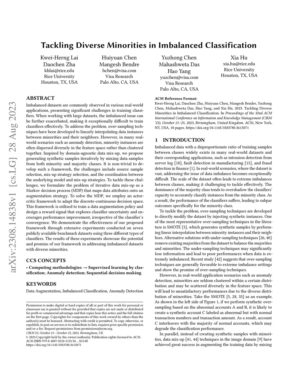 Imbalanced datasets are commonly observed in various real-world applications, presenting significant challenges in training classifiers. When working with large datasets, the imbalanced issue can be further exacerbated, making it exceptionally difficult to train classifiers effectively. To address the problem, over-sampling techniques have been developed to linearly interpolating data instances between minorities and their neighbors. However, in many real-world scenarios such as anomaly detection, minority instances are often dispersed diversely in the feature space rather than clustered together. Inspired by domain-agnostic data mix-up, we propose generating synthetic samples iteratively by mixing data samples from both minority and majority classes. It is non-trivial to develop such a framework, the challenges include source sample selection, mix-up strategy selection, and the coordination between the underlying model and mix-up strategies. To tackle these challenges, we formulate the problem of iterative data mix-up as a Markov decision process (MDP) that maps data attributes onto an augmentation strategy. To solve the MDP, we employ an actor-critic framework to adapt the discrete-continuous decision space. This framework is utilized to train a data augmentation policy and design a reward signal that explores classifier uncertainty and encourages performance improvement, irrespective of the classifier's convergence. We demonstrate the effectiveness of our proposed framework through extensive experiments conducted on seven publicly available benchmark datasets using three different types of classifiers. The results of these experiments showcase the potential and promise of our framework in addressing imbalanced datasets with diverse minorities.