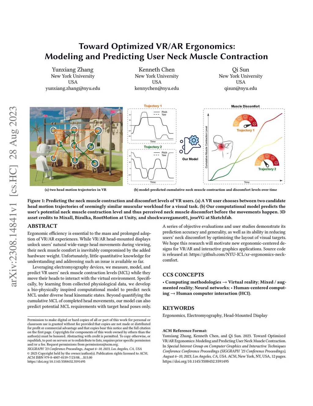 Ergonomic efficiency is essential to the mass and prolonged adoption of VR/AR experiences. While VR/AR head-mounted displays unlock users' natural wide-range head movements during viewing, their neck muscle comfort is inevitably compromised by the added hardware weight. Unfortunately, little quantitative knowledge for understanding and addressing such an issue is available so far. Leveraging electromyography devices, we measure, model, and predict VR users' neck muscle contraction levels (MCL) while they move their heads to interact with the virtual environment. Specifically, by learning from collected physiological data, we develop a bio-physically inspired computational model to predict neck MCL under diverse head kinematic states. Beyond quantifying the cumulative MCL of completed head movements, our model can also predict potential MCL requirements with target head poses only. A series of objective evaluations and user studies demonstrate its prediction accuracy and generality, as well as its ability in reducing users' neck discomfort by optimizing the layout of visual targets. We hope this research will motivate new ergonomic-centered designs for VR/AR and interactive graphics applications. Source code is released at: https://github.com/NYU-ICL/xr-ergonomics-neck-comfort.