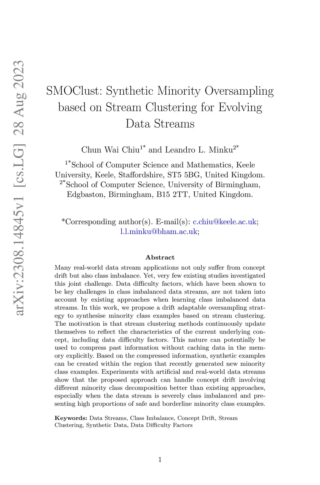SMOClust: Synthetic Minority Oversampling based on Stream Clustering for