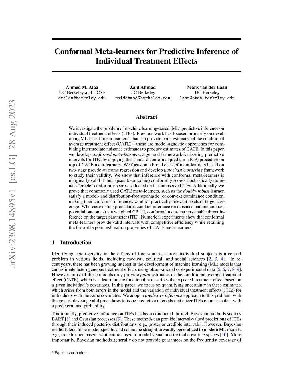 We investigate the problem of machine learning-based (ML) predictive inference on individual treatment effects (ITEs). Previous work has focused primarily on developing ML-based meta-learners that can provide point estimates of the conditional average treatment effect (CATE); these are model-agnostic approaches for combining intermediate nuisance estimates to produce estimates of CATE. In this paper, we develop conformal meta-learners, a general framework for issuing predictive intervals for ITEs by applying the standard conformal prediction (CP) procedure on top of CATE meta-learners. We focus on a broad class of meta-learners based on two-stage pseudo-outcome regression and develop a stochastic ordering framework to study their validity. We show that inference with conformal meta-learners is marginally valid if their (pseudo outcome) conformity scores stochastically dominate oracle conformity scores evaluated on the unobserved ITEs. Additionally, we prove that commonly used CATE meta-learners, such as the doubly-robust learner, satisfy a model- and distribution-free stochastic (or convex) dominance condition, making their conformal inferences valid for practically-relevant levels of target coverage. Whereas existing procedures conduct inference on nuisance parameters (i.e., potential outcomes) via weighted CP, conformal meta-learners enable direct inference on the target parameter (ITE). Numerical experiments show that conformal meta-learners provide valid intervals with competitive efficiency while retaining the favorable point estimation properties of CATE meta-learners.