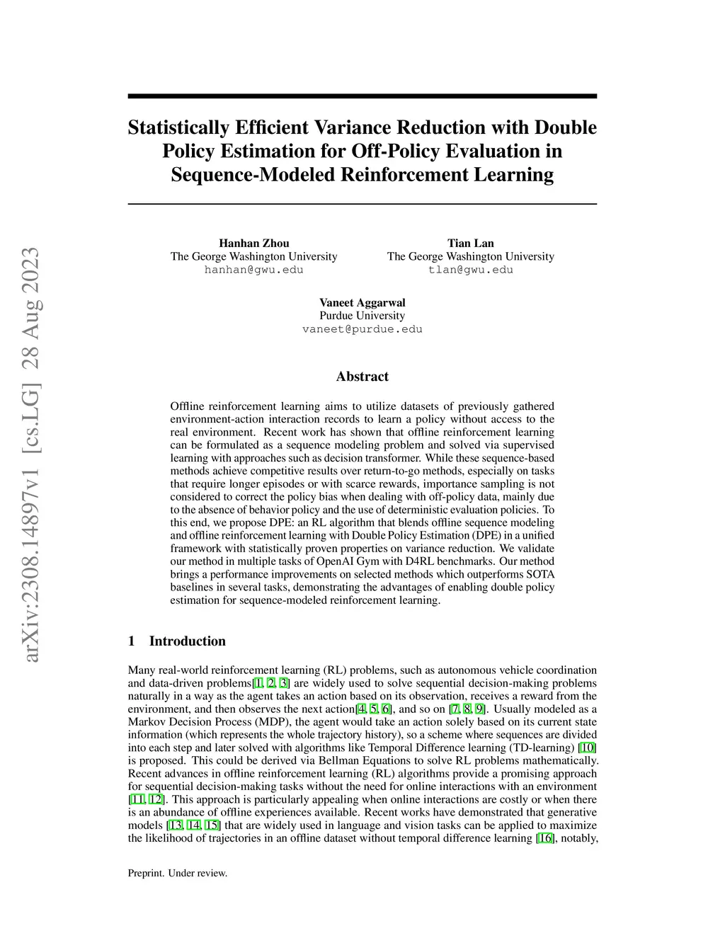 Offline reinforcement learning aims to utilize datasets of previously gathered environment-action interaction records to learn a policy without access to the real environment. Recent work has shown that offline reinforcement learning can be formulated as a sequence modeling problem and solved via supervised learning with approaches such as decision transformer. While these sequence-based methods achieve competitive results over return-to-go methods, especially on tasks that require longer episodes or with scarce rewards, importance sampling is not considered to correct the policy bias when dealing with off-policy data, mainly due to the absence of behavior policy and the use of deterministic evaluation policies. To this end, we propose DPE: an RL algorithm that blends offline sequence modeling and offline reinforcement learning with Double Policy Estimation (DPE) in a unified framework with statistically proven properties on variance reduction. We validate our method in multiple tasks of OpenAI Gym with D4RL benchmarks. Our method brings a performance improvements on selected methods which outperforms SOTA baselines in several tasks, demonstrating the advantages of enabling double policy estimation for sequence-modeled reinforcement learning.
