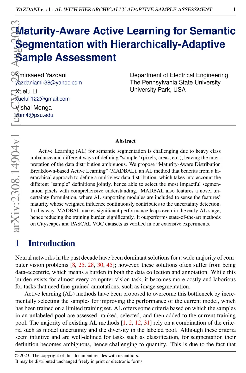 Active Learning (AL) for semantic segmentation is challenging due to heavy class imbalance and different ways of defining "sample" (pixels, areas, etc.), leaving the interpretation of the data distribution ambiguous. We propose "Maturity-Aware Distribution Breakdown-based Active Learning'' (MADBAL), an AL method that benefits from a hierarchical approach to define a multiview data distribution, which takes into account the different "sample" definitions jointly, hence able to select the most impactful segmentation pixels with comprehensive understanding. MADBAL also features a novel uncertainty formulation, where AL supporting modules are included to sense the features' maturity whose weighted influence continuously contributes to the uncertainty detection. In this way, MADBAL makes significant performance leaps even in the early AL stage, hence reducing the training burden significantly. It outperforms state-of-the-art methods on Cityscapes and PASCAL VOC datasets as verified in our extensive experiments.