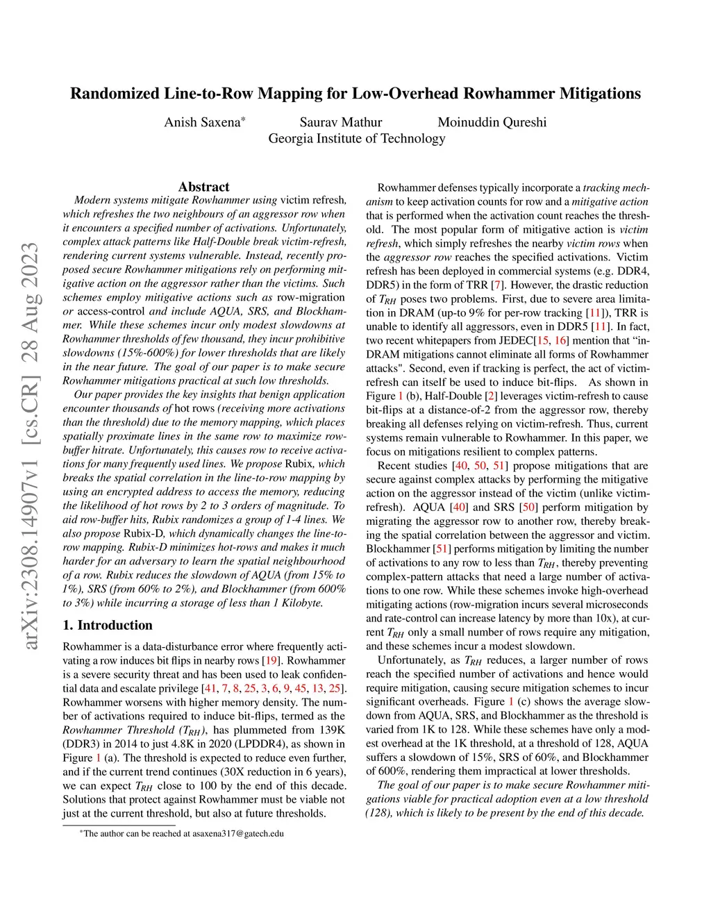 Modern systems mitigate Rowhammer using victim refresh, which refreshes the two neighbours of an aggressor row when it encounters a specified number of activations. Unfortunately, complex attack patterns like Half-Double break victim-refresh, rendering current systems vulnerable. Instead, recently proposed secure Rowhammer mitigations rely on performing mitigative action on the aggressor rather than the victims. Such schemes employ mitigative actions such as row-migration or access-control and include AQUA, SRS, and Blockhammer. While these schemes incur only modest slowdowns at Rowhammer thresholds of few thousand, they incur prohibitive slowdowns (15%-600%) for lower thresholds that are likely in the near future. The goal of our paper is to make secure Rowhammer mitigations practical at such low thresholds. Our paper provides the key insights that benign application encounter thousands of hot rows (receiving more activations than the threshold) due to the memory mapping, which places spatially proximate lines in the same row to maximize row-buffer hitrate. Unfortunately, this causes row to receive activations for many frequently used lines. We propose Rubix, which breaks the spatial correlation in the line-to-row mapping by using an encrypted address to access the memory, reducing the likelihood of hot rows by 2 to 3 orders of magnitude. To aid row-buffer hits, Rubix randomizes a group of 1-4 lines. We also propose Rubix-D, which dynamically changes the line-to-row mapping. Rubix-D minimizes hot-rows and makes it much harder for an adversary to learn the spatial neighbourhood of a row. Rubix reduces the slowdown of AQUA (from 15% to 1%), SRS (from 60% to 2%), and Blockhammer (from 600% to 3%) while incurring a storage of less than 1 Kilobyte.