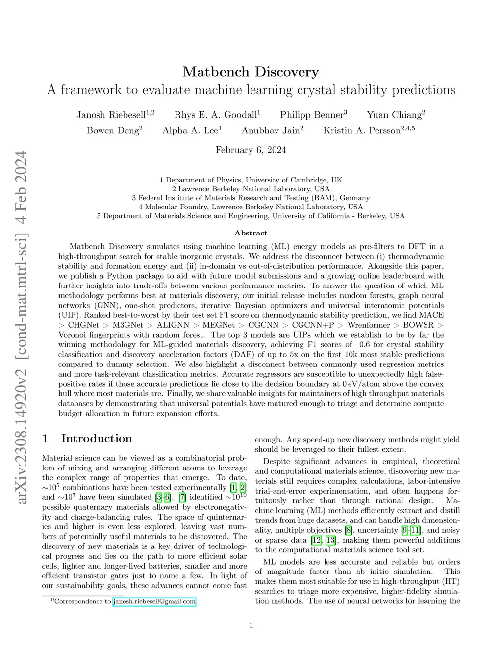 Matbench Discovery simulates the deployment of machine learning (ML) energy models in a high-throughput search for stable inorganic crystals. We address the disconnect between (i) thermodynamic stability and formation energy and (ii) in-domain vs out-of-distribution performance. Alongside this paper, we publish a Python package to aid with future model submissions and a growing online leaderboard with further insights into trade-offs between various performance metrics. To answer the question which ML methodology performs best at materials discovery, our initial release explores a variety of models including random forests, graph neural networks (GNN), one-shot predictors, iterative Bayesian optimizers and universal interatomic potentials (UIP). Ranked best-to-worst by their test set F1 score on thermodynamic stability prediction, we find CHGNet > M3GNet > MACE > ALIGNN > MEGNet > CGCNN > CGCNN+P > Wrenformer > BOWSR > Voronoi tessellation fingerprints with random forest. The top 3 models are UIPs, the winning methodology for ML-guided materials discovery, achieving F1 scores of ~0.6 for crystal stability classification and discovery acceleration factors (DAF) of up to 5x on the first 10k most stable predictions compared to dummy selection from our test set. We also highlight a sharp disconnect between commonly used global regression metrics and more task-relevant classification metrics. Accurate regressors are susceptible to unexpectedly high false-positive rates if those accurate predictions lie close to the decision boundary at 0 eV/atom above the convex hull where most materials are. Our results highlight the need to focus on classification metrics that actually correlate with improved stability hit rate.