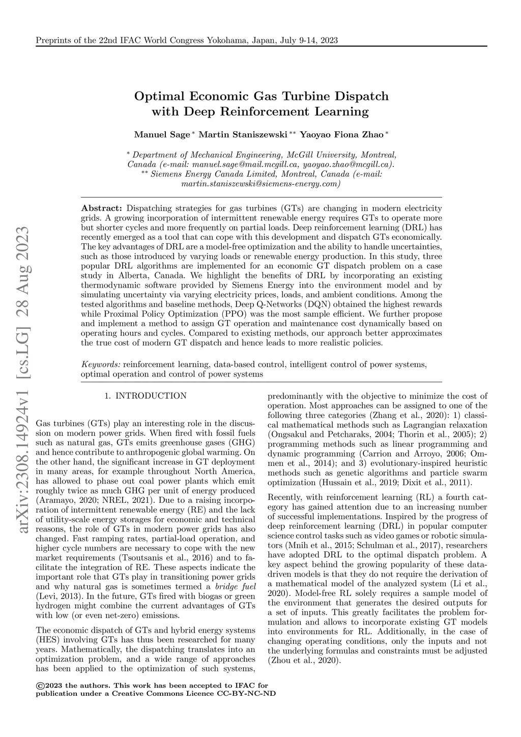 Optimal Economic Gas Turbine Dispatch with Deep Reinforcement Learning