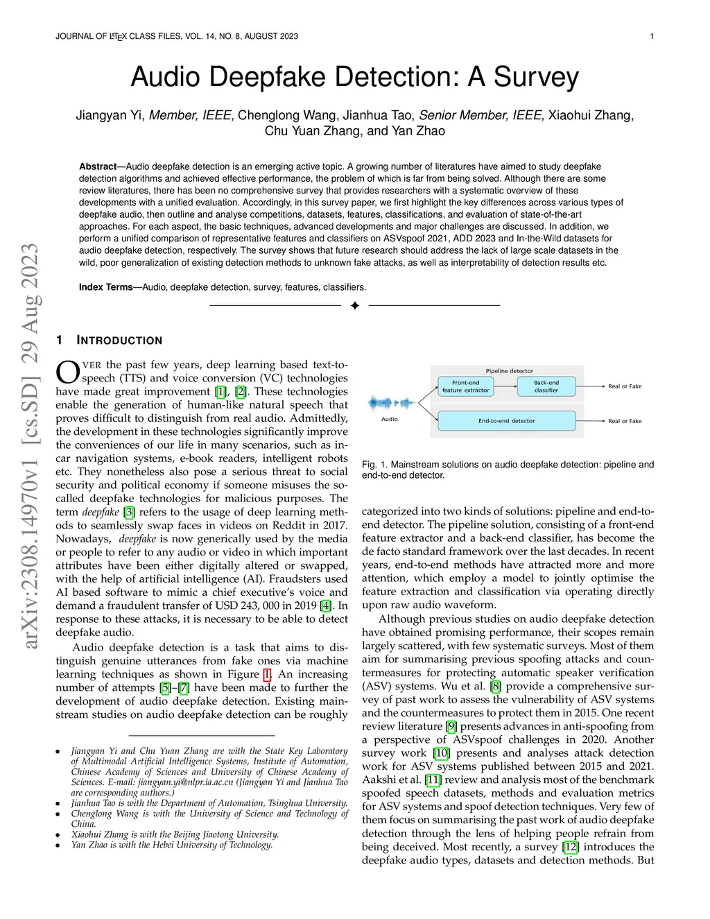 Audio deepfake detection is an emerging active topic. A growing number of literatures have aimed to study deepfake detection algorithms and achieved effective performance, the problem of which is far from being solved. Although there are some review literatures, there has been no comprehensive survey that provides researchers with a systematic overview of these developments with a unified evaluation. Accordingly, in this survey paper, we first highlight the key differences across various types of deepfake audio, then outline and analyse competitions, datasets, features, classifications, and evaluation of state-of-the-art approaches. For each aspect, the basic techniques, advanced developments and major challenges are discussed. In addition, we perform a unified comparison of representative features and classifiers on ASVspoof 2021, ADD 2023 and In-the-Wild datasets for audio deepfake detection, respectively. The survey shows that future research should address the lack of large scale datasets in the wild, poor generalization of existing detection methods to unknown fake attacks, as well as interpretability of detection results.
