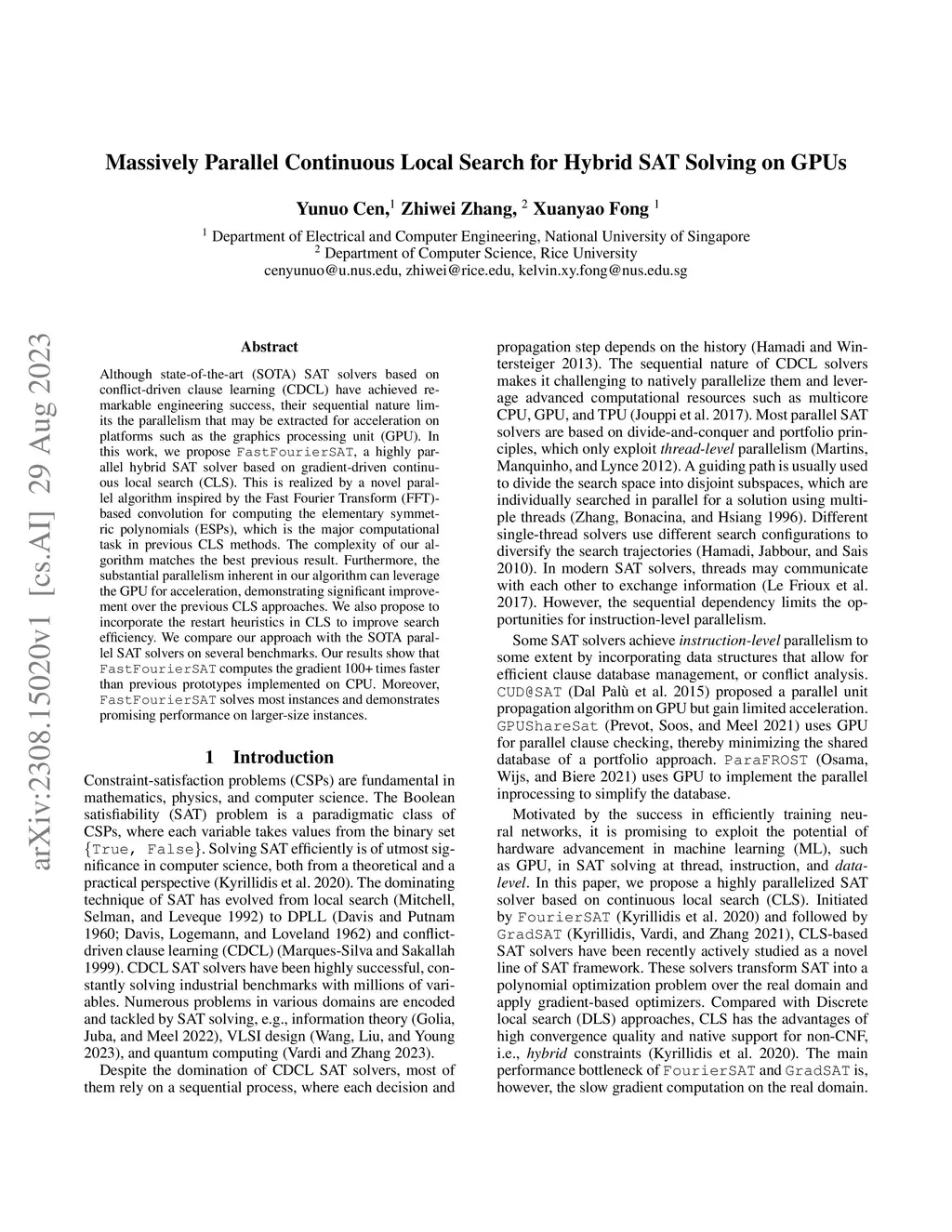 Although state-of-the-art (SOTA) SAT solvers based on conflict-driven clause learning (CDCL) have achieved remarkable engineering success, their sequential nature limits the parallelism that may be extracted for acceleration on platforms such as the graphics processing unit (GPU). In this work, we propose FastFourierSAT, a highly parallel hybrid SAT solver based on gradient-driven continuous local search (CLS). This is realized by a novel parallel algorithm inspired by the Fast Fourier Transform (FFT)-based convolution for computing the elementary symmetric polynomials (ESPs), which is the major computational task in previous CLS methods. The complexity of our algorithm matches the best previous result. Furthermore, the substantial parallelism inherent in our algorithm can leverage the GPU for acceleration, demonstrating significant improvement over the previous CLS approaches. We also propose to incorporate the restart heuristics in CLS to improve search efficiency. We compare our approach with the SOTA parallel SAT solvers on several benchmarks. Our results show that FastFourierSAT computes the gradient 100+ times faster than previous prototypes implemented on CPU. Moreover, FastFourierSAT solves most instances and demonstrates promising performance on larger-size instances.