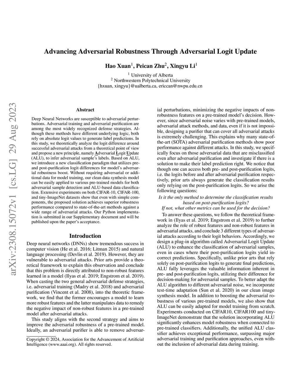 Deep Neural Networks are susceptible to adversarial perturbations. Adversarial training and adversarial purification are among the most widely recognized defense strategies. Although these methods have different underlying logic, both rely on absolute logit values to generate label predictions. In this study, we theoretically analyze the logit difference around successful adversarial attacks from a theoretical point of view and propose a new principle, namely Adversarial Logit Update (ALU), to infer adversarial sample's labels. Based on ALU, we introduce a new classification paradigm that utilizes pre- and post-purification logit differences for model's adversarial robustness boost. Without requiring adversarial or additional data for model training, our clean data synthesis model can be easily applied to various pre-trained models for both adversarial sample detection and ALU-based data classification. Extensive experiments on both CIFAR-10, CIFAR-100, and tiny-ImageNet datasets show that even with simple components, the proposed solution achieves superior robustness performance compared to state-of-the-art methods against a wide range of adversarial attacks. Our python implementation is submitted in our Supplementary document and will be published upon the paper's acceptance.