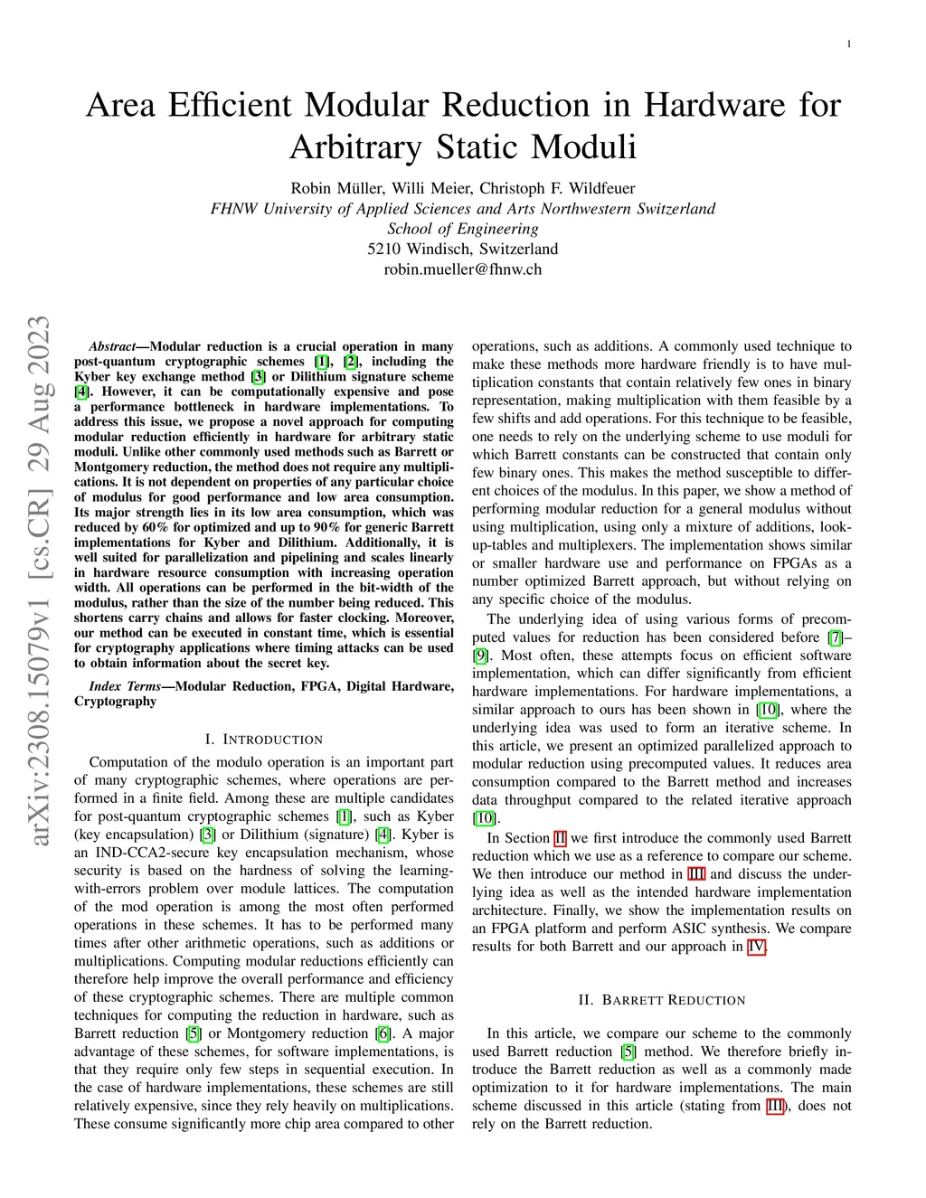 Area Efficient Modular Reduction in Hardware for Arbitrary Static Moduli