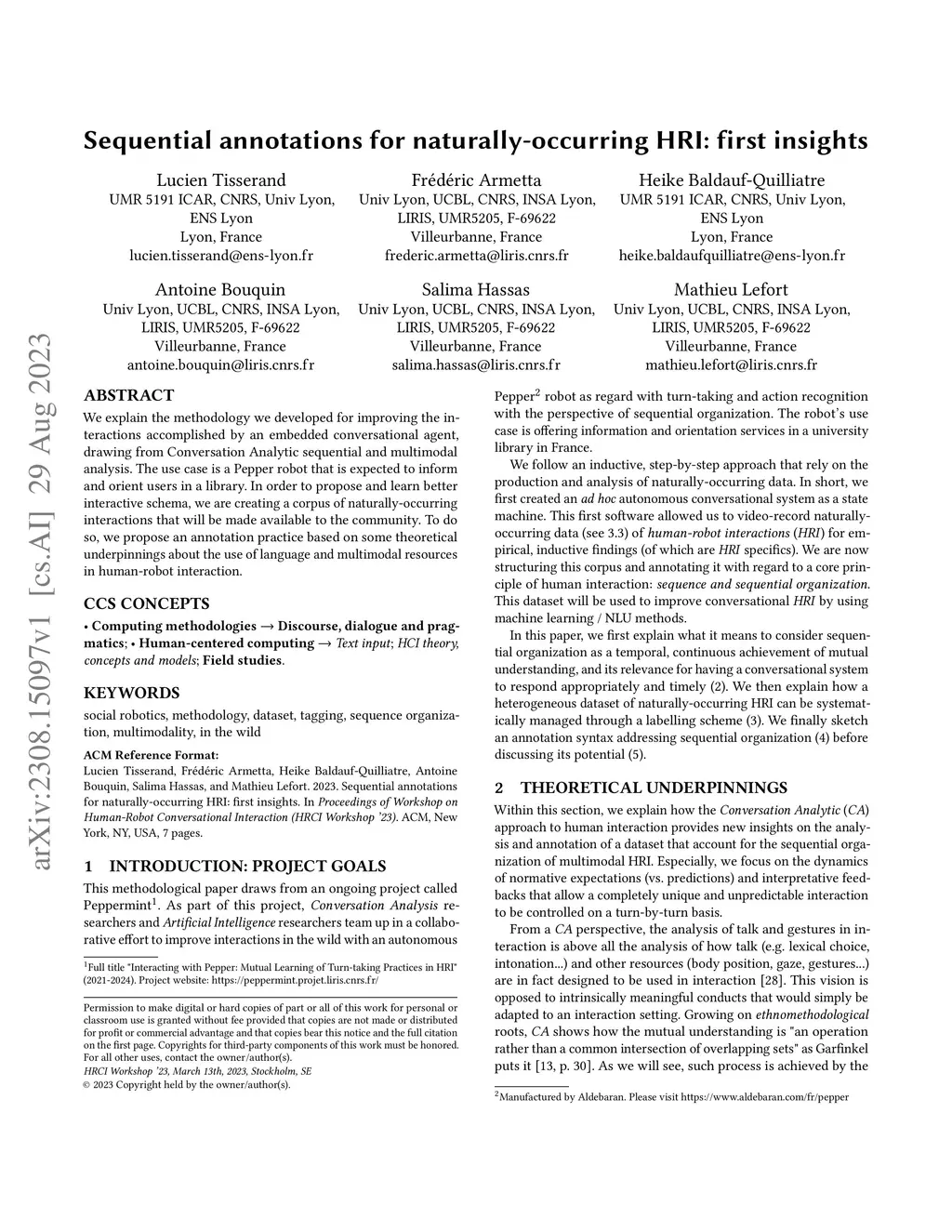 We explain the methodology we developed for improving the interactions accomplished by an embedded conversational agent, drawing from Conversation Analytic sequential and multimodal analysis. The use case is a Pepper robot that is expected to inform and orient users in a library. In order to propose and learn better interactive schema, we are creating a corpus of naturally-occurring interactions that will be made available to the community. To do so, we propose an annotation practice based on some theoretical underpinnings about the use of language and multimodal resources in human-robot interaction. CCS CONCEPTS Computing methodologies Discourse, dialogue and pragmatics; Human-centered computing Text input; HCI theory, concepts and models; Field studies.