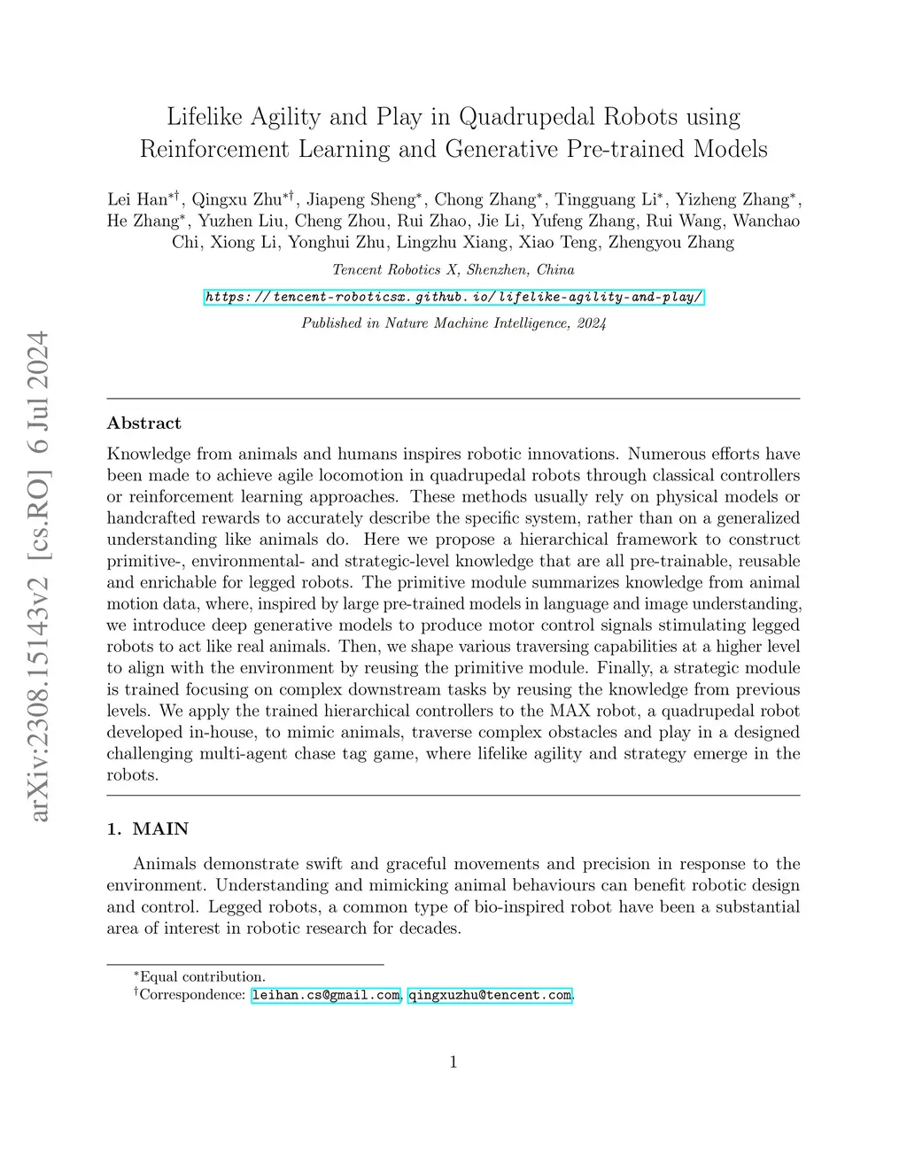 Knowledge from animals and humans inspires robotic innovations. Numerous efforts have been made to achieve agile locomotion in quadrupedal robots through classical controllers or reinforcement learning approaches. These methods usually rely on physical models or handcrafted rewards to accurately describe the specific system, rather than on a generalized understanding like animals do. Here we propose a hierarchical framework to construct primitive-, environmental- and strategic-level knowledge that are all pre-trainable, reusable and enrichable for legged robots. The primitive module summarizes knowledge from animal motion data, where, inspired by large pre-trained models in language and image understanding, we introduce deep generative models to produce motor control signals stimulating legged robots to act like real animals. Then, we shape various traversing capabilities at a higher level to align with the environment by reusing the primitive module. Finally, a strategic module is trained focusing on complex downstream tasks by reusing the knowledge from previous levels. We apply the trained hierarchical controllers to the MAX robot, a quadrupedal robot developed in-house, to mimic animals, traverse complex obstacles and play in a designed challenging multi-agent chase tag game, where lifelike agility and strategy emerge in the robots.