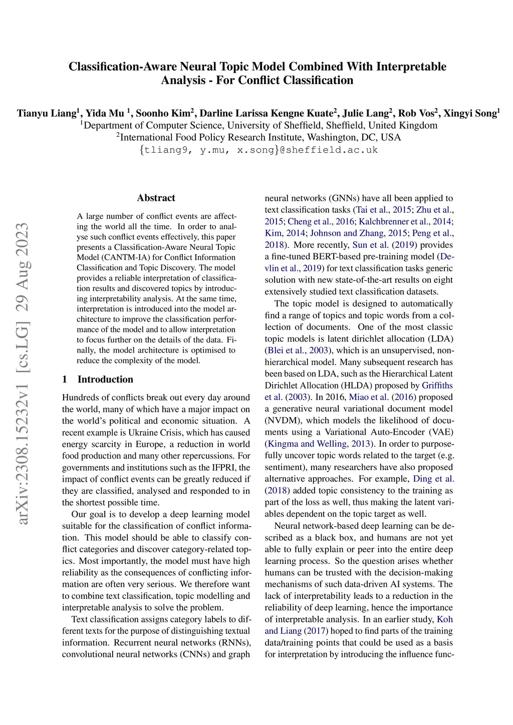A large number of conflict events are affecting the world all the time. In order to analyse such conflict events effectively, this paper presents a Classification-Aware Neural Topic Model (CANTM-IA) for Conflict Information Classification and Topic Discovery. The model provides a reliable interpretation of classification results and discovered topics by introducing interpretability analysis. At the same time, interpretation is introduced into the model architecture to improve the classification performance of the model and to allow interpretation to focus further on the details of the data. Finally, the model architecture is optimised to reduce the complexity of the model.