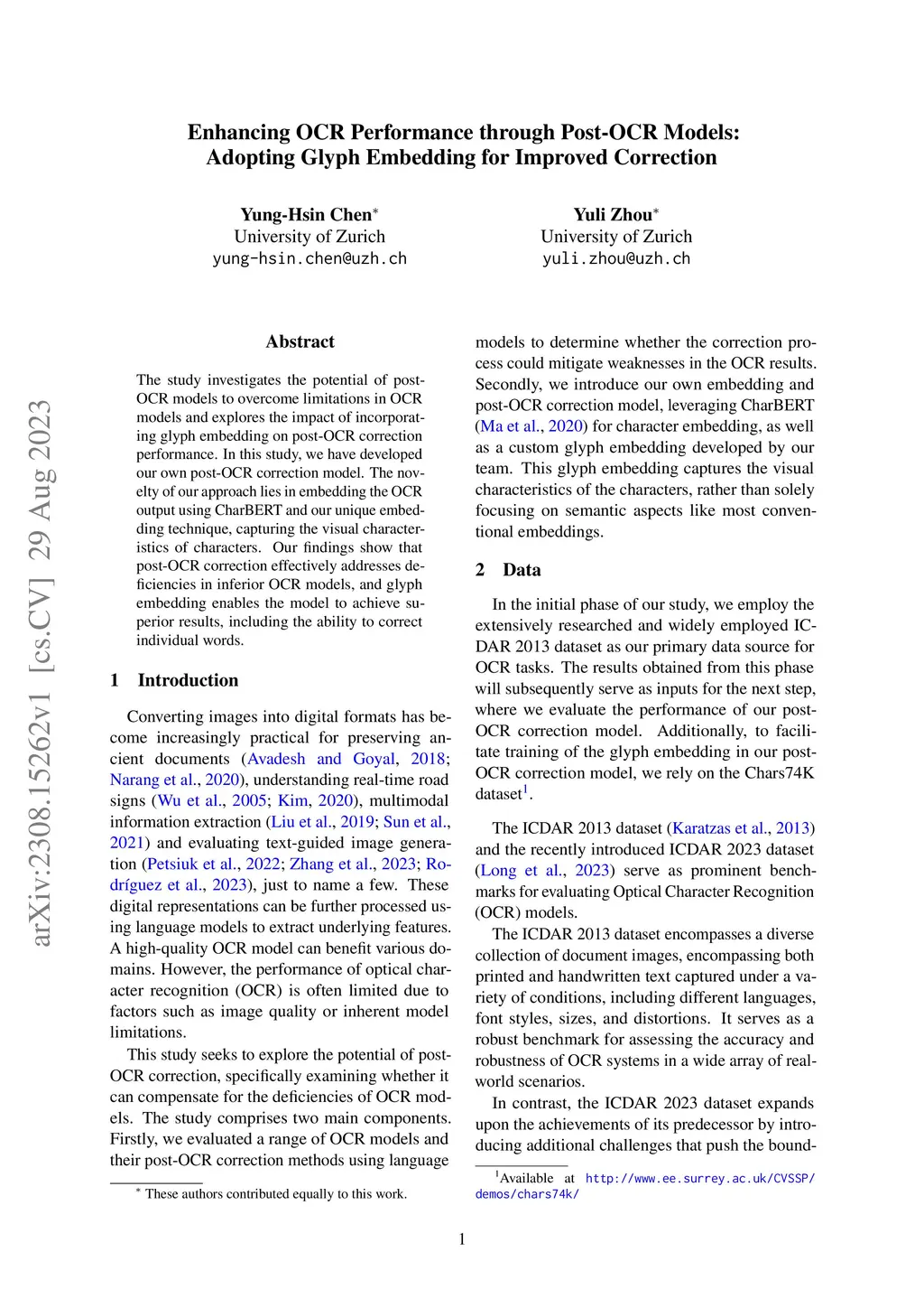 The study investigates the potential of post-OCR models to overcome limitations in OCR models and explores the impact of incorporating glyph embedding on post-OCR correction performance. In this study, we have developed our own post-OCR correction model. The novelty of our approach lies in embedding the OCR output using CharBERT and our unique embedding technique, capturing the visual characteristics of characters. Our findings show that post-OCR correction effectively addresses deficiencies in inferior OCR models, and glyph embedding enables the model to achieve superior results, including the ability to correct individual words.