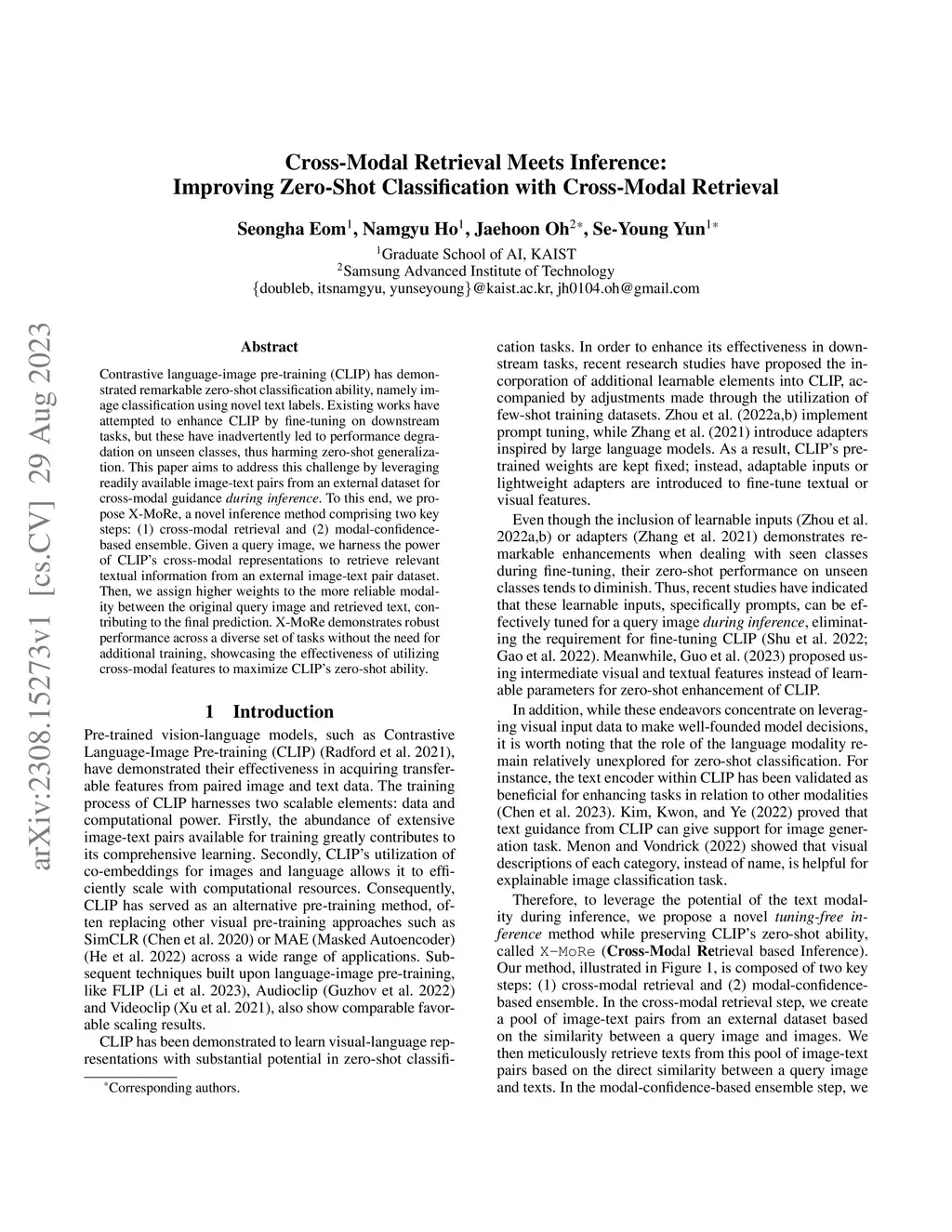Contrastive language-image pre-training (CLIP) has demonstrated remarkable zero-shot classification ability, namely image classification using novel text labels. Existing works have attempted to enhance CLIP by fine-tuning on downstream tasks, but these have inadvertently led to performance degradation on unseen classes, thus harming zero-shot generalization. This paper aims to address this challenge by leveraging readily available image-text pairs from an external dataset for cross-modal guidance during inference. To this end, we propose X-MoRe, a novel inference method comprising two key steps: (1) cross-modal retrieval and (2) modal-confidence-based ensemble. Given a query image, we harness the power of CLIP's cross-modal representations to retrieve relevant textual information from an external image-text pair dataset. Then, we assign higher weights to the more reliable modality between the original query image and retrieved text, contributing to the final prediction. X-MoRe demonstrates robust performance across a diverse set of tasks without the need for additional training, showcasing the effectiveness of utilizing cross-modal features to maximize CLIP's zero-shot ability.