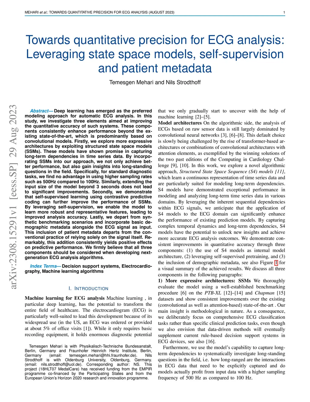 Deep learning has emerged as the preferred modeling approach for automatic ECG analysis. In this study, we investigate three elements aimed at improving the quantitative accuracy of such systems. These components consistently enhance performance beyond the existing state-of-the-art, which is predominantly based on convolutional models. Firstly, we explore more expressive architectures by exploiting structured state space models (SSMs). These models have shown promise in capturing long-term dependencies in time series data. By incorporating SSMs into our approach, we not only achieve better performance, but also gain insights into long-standing questions in the field. Specifically, for standard diagnostic tasks, we find no advantage in using higher sampling rates such as 500Hz compared to 100Hz. Similarly, extending the input size of the model beyond 3 seconds does not lead to significant improvements. Secondly, we demonstrate that self-supervised learning using contrastive predictive coding can further improve the performance of SSMs. By leveraging self-supervision, we enable the model to learn more robust and representative features, leading to improved analysis accuracy. Lastly, we depart from synthetic benchmarking scenarios and incorporate basic demographic metadata alongside the ECG signal as input. This inclusion of patient metadata departs from the conventional practice of relying solely on the signal itself. Remarkably, this addition consistently yields positive effects on predictive performance. We firmly believe that all three components should be considered when developing next-generation ECG analysis algorithms.