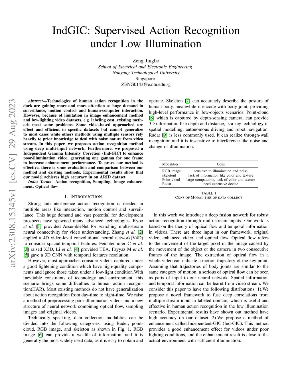 Technologies of human action recognition in the dark are gaining more and more attention as huge demand in surveillance, motion control and human-computer interaction. However, because of limitation in image enhancement method and low-lighting video datasets, e.g. labeling cost, existing methods meet some problems. Some video-based approached are effect and efficient in specific datasets but cannot generalize to most cases while others methods using multiple sensors rely heavily to prior knowledge to deal with noisy nature from video stream. In this paper, we proposes action recognition method using deep multi-input network. Furthermore, we proposed a Independent Gamma Intensity Corretion (Ind-GIC) to enhance poor-illumination video, generating one gamma for one frame to increase enhancement performance. To prove our method is effective, there is some evaluation and comparison between our method and existing methods. Experimental results show that our model achieves high accuracy in on ARID dataset.