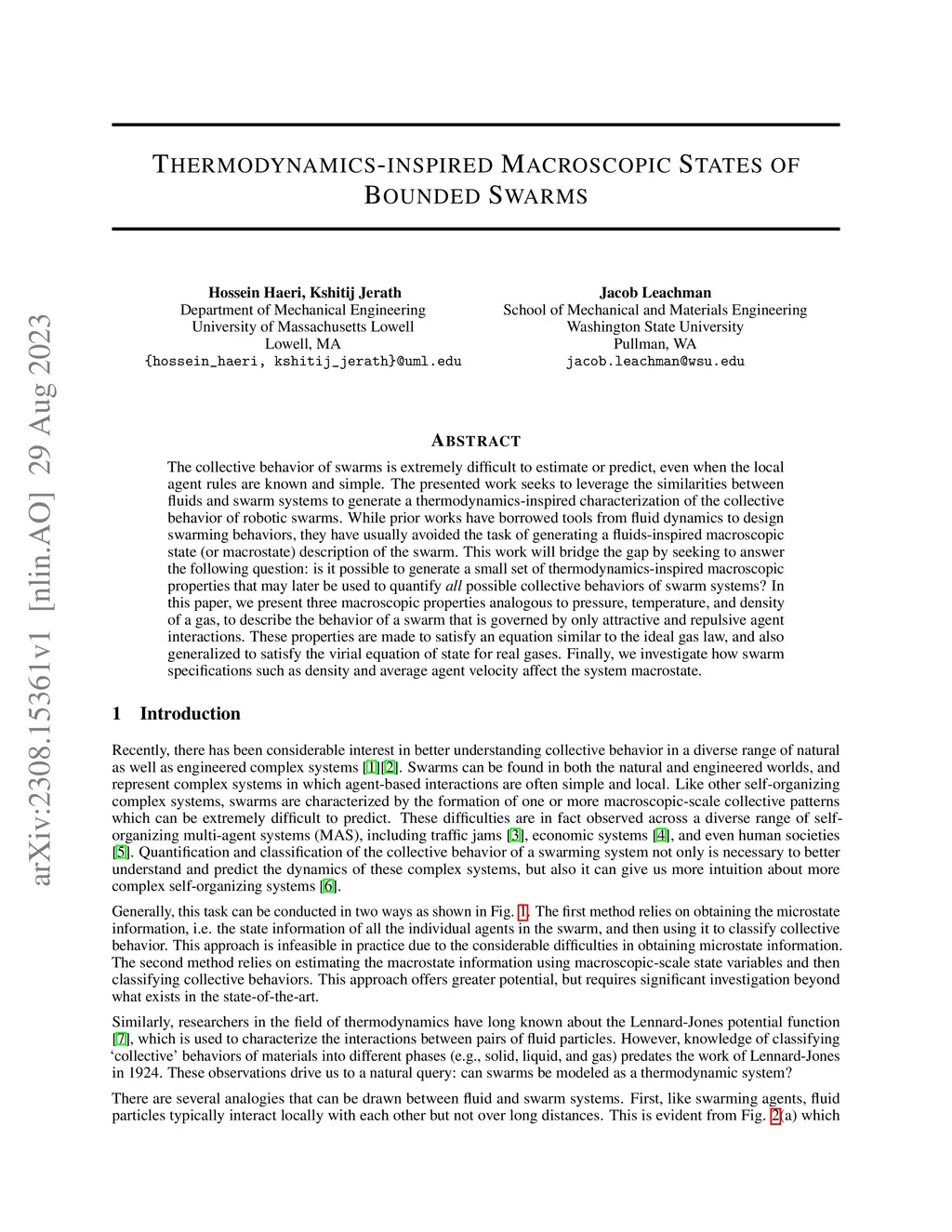 The collective behavior of swarms is extremely difficult to estimate or predict, even when the local agent rules are known and simple. The presented work seeks to leverage the similarities between fluids and swarm systems to generate a thermodynamics-inspired characterization of the collective behavior of robotic swarms. While prior works have borrowed tools from fluid dynamics to design swarming behaviors, they have usually avoided the task of generating a fluids-inspired macroscopic state (or macrostate) description of the swarm. This work will bridge the gap by seeking to answer the following question: is it possible to generate a small set of thermodynamics-inspired macroscopic properties that may later be used to quantify all possible collective behaviors of swarm systems? In this paper, we present three macroscopic properties analogous to pressure, temperature, and density of a gas, to describe the behavior of a swarm that is governed by only attractive and repulsive agent interactions. These properties are made to satisfy an equation similar to the ideal gas law, and also generalized to satisfy the virial equation of state for real gases. Finally, we investigate how swarm specifications such as density and average agent velocity affect the system macrostate.