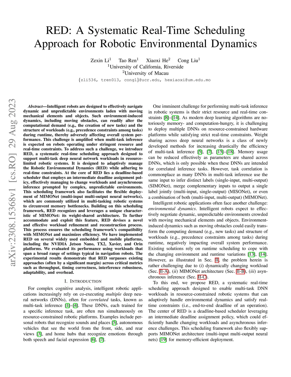 Intelligent robots are designed to effectively navigate dynamic and unpredictable environments laden with moving mechanical elements and objects. Such environment-induced dynamics, including moving obstacles, can readily alter the computational demand (e.g., the creation of new tasks) and the structure of workloads (e.g., precedence constraints among tasks) during runtime, thereby adversely affecting overall system performance. This challenge is amplified when multi-task inference is expected on robots operating under stringent resource and real-time constraints. To address such a challenge, we introduce RED, a systematic real-time scheduling approach designed to support multi-task deep neural network workloads in resource-limited robotic systems. It is designed to adaptively manage the Robotic Environmental Dynamics (RED) while adhering to real-time constraints. At the core of RED lies a deadline-based scheduler that employs an intermediate deadline assignment policy, effectively managing to change workloads and asynchronous inference prompted by complex, unpredictable environments. This scheduling framework also facilitates the flexible deployment of MIMONet (multi-input multi-output neural networks), which are commonly utilized in multi-tasking robotic systems to circumvent memory bottlenecks. Building on this scheduling framework, RED recognizes and leverages a unique characteristic of MIMONet: its weight-shared architecture. To further accommodate and exploit this feature, RED devises a novel and effective workload refinement and reconstruction process. This process ensures the scheduling framework's compatibility with MIMONet and maximizes efficiency.