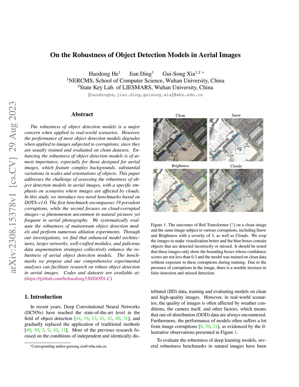 The robustness of object detection models is a major concern when applied to real-world scenarios. The performance of most models tends to degrade when confronted with images affected by corruptions, since they are usually trained and evaluated on clean datasets. While numerous studies have explored the robustness of object detection models on natural images, there is a paucity of research focused on models applied to aerial images, which feature complex backgrounds, substantial variations in scales, and orientations of objects. This paper addresses the challenge of assessing the robustness of object detection models on aerial images, with a specific emphasis on scenarios where images are affected by clouds. In this study, we introduce two novel benchmarks based on DOTA-v1.0. The first benchmark encompasses 19 prevalent corruptions, while the second focuses on the cloud-corrupted condition-a phenomenon uncommon in natural images yet frequent in aerial photography. We systematically evaluate the robustness of mainstream object detection models and perform necessary ablation experiments. Through our investigations, we find that rotation-invariant modeling and enhanced backbone architectures can improve the robustness of models. Furthermore, increasing the capacity of Transformer-based backbones can strengthen their robustness. The benchmarks we propose and our comprehensive experimental analyses can facilitate research on robust object detection on aerial images. The codes and datasets are available at:this https URL.
