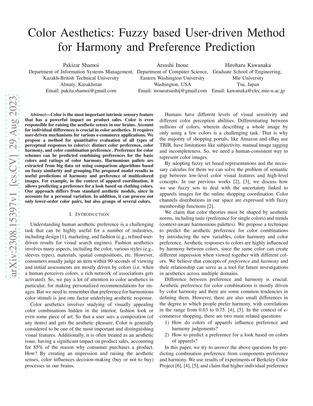 Color is the most important intrinsic sensory feature that has a powerful impact on product sales. Color is even responsible for raising the aesthetic senses in our brains. Account for individual differences is crucial in color aesthetics. It requires user-driven mechanisms for various e-commerce applications. We propose a method for quantitative evaluation of all types of perceptual responses to color(s): distinct color preference, color harmony, and color combination preference. Preference for color schemes can be predicted by combining preferences for the basic colors and ratings of color harmony. Harmonious pallets are extracted from big data set using comparison algorithms based on fuzzy similarity and grouping. The proposed model results in useful predictions of harmony and preference of multicolored images. For example, in the context of apparel coordination, it allows predicting a preference for a look based on clothing colors. Our approach differs from standard aesthetic models, since in accounts for a personal variation. In addition, it can process not only lower-order color pairs, but also groups of several colors.