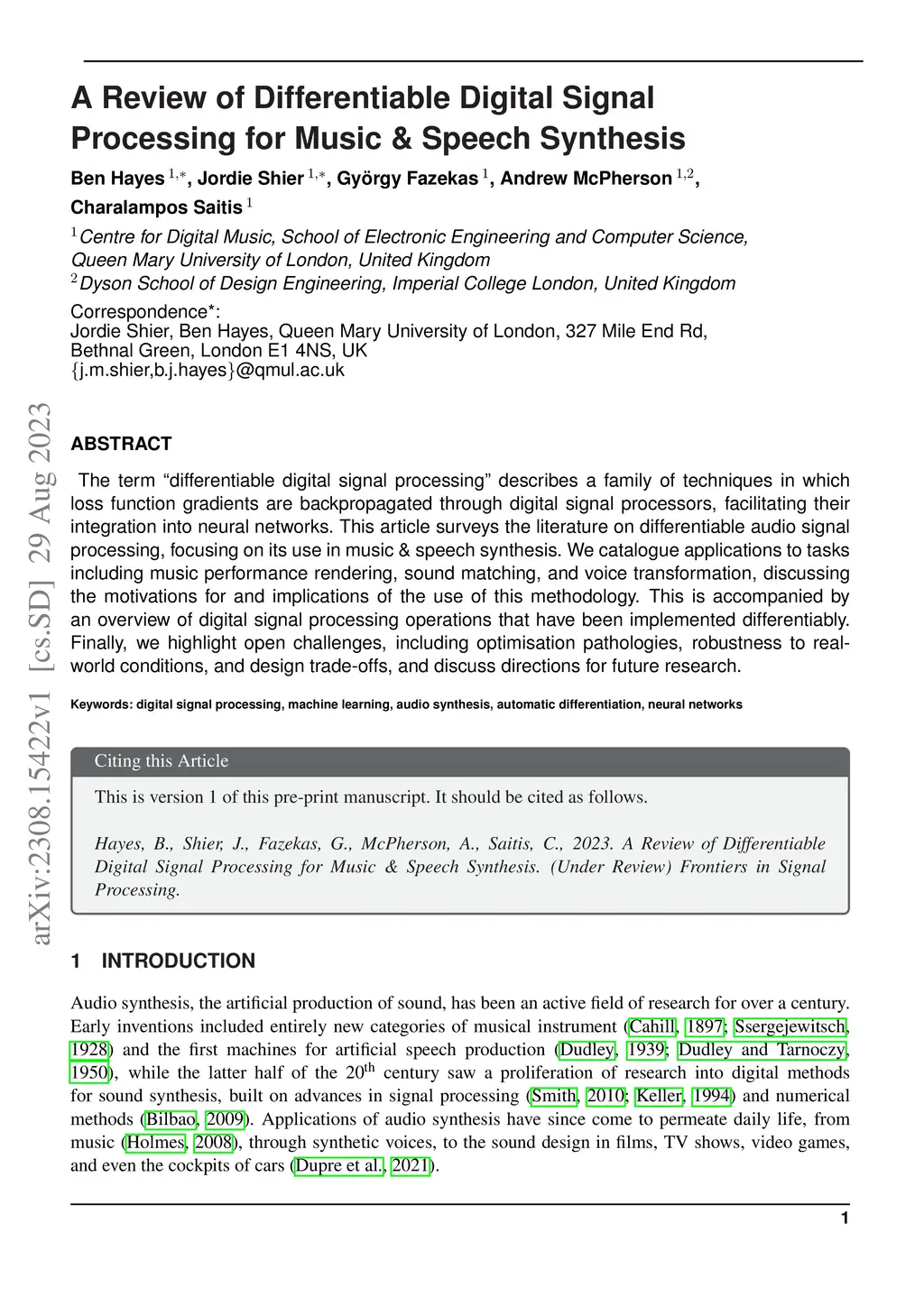 The term "differentiable digital signal processing" describes a family of techniques in which loss function gradients are backpropagated through digital signal processors, facilitating their integration into neural networks. This article surveys the literature on differentiable audio signal processing, focusing on its use in music & speech synthesis. We catalogue applications to tasks including music performance rendering, sound matching, and voice transformation, discussing the motivations for and implications of the use of this methodology. This is accompanied by an overview of digital signal processing operations that have been implemented differentiably. Finally, we highlight open challenges, including optimisation pathologies, robustness to real-world conditions, and design trade-offs, and discuss directions for future research.